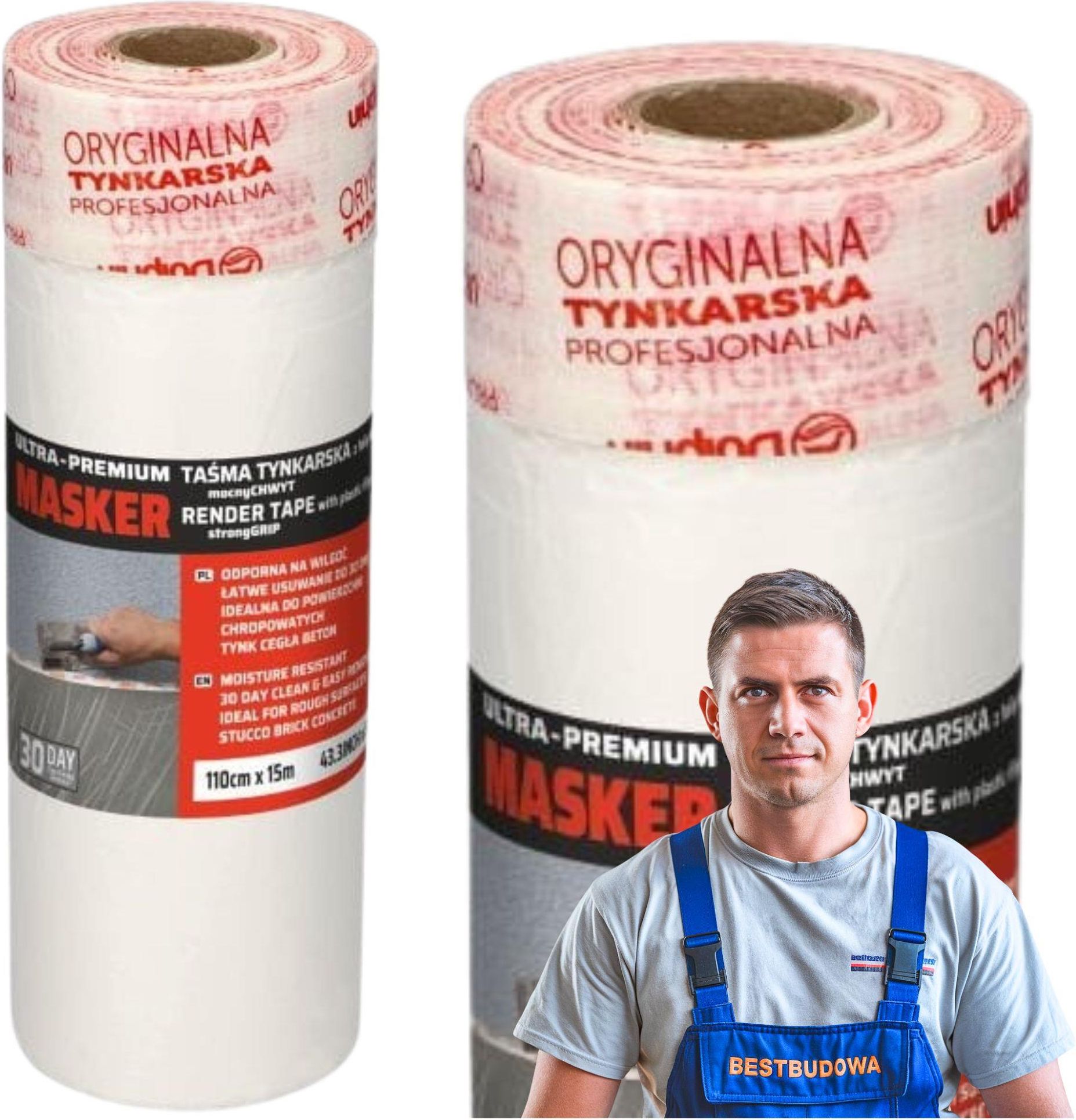 MASKER TYNKARSKI Z FOLIĄ 110CM X 15M 30 DNI BLUEDOLPHIN DO TYNKÓW I ELEWACJI 🔹 NAJWAŻNIEJSZE ZALETY Szerokość folii 110 cm, długość 15 m – doskonała do ochrony średnich powierzchni Taśma tynkarska 30 dni – przylega do trudnych, chropowatych podłoży Folia elektrostatyczna – przylega do powierzchni, nie zsuwa się podczas pracy Odporna na wilgoć i uszkodzenia mechaniczne – sprawdza się w warunkach budowlanych Specjalny nośnik – umożliwia ręczne przerywanie taśmy wzdłuż i w poprzek Łatwe usuwanie bez pozostawienia śladów kleju – nawet po 30 dniach DLACZEGO WARTO KUPIĆ MASKER TYNKARSKI 110CM X 15M Z FOLIĄ I TAŚMĄ 30 DNI BLUE DOLPHIN to praktyczne i niezawodne narzędzie do ochrony powierzchni podczas tynkowania, malowania oraz prac elewacyjnych. Folia elektrostatyczna idealnie przylega do powierzchni takich jak okna, glazura, parapety czy płyty, a taśma tynkarska zapewnia doskonałą przyczepność nawet do betonu, tynku, kamienia czy cegły. System "masker" oszczędza czas i usprawnia pracę, a produkt spełnia wymagania zarówno profesjonalistów, jak i osób wykonujących prace remontowe we własnym zakresie. DANE TECHNICZNE Marka: BlueDolphin Rodzaj: Masker tynkarski z folią malarską Szerokość folii: 110 cm Długość: 15 m Rodzaj folii: Elektrostatyczna Rodzaj taśmy: Tynkarska – trwała, odporna na wilgoć i mechaniczne uszkodzenia Czas przyczepności: do 30 dni Zastosowanie: Do ochrony chropowatych i trudnych powierzchni 🎯 ZASTOSOWANIE Prace tynkarskie, elewacyjne i malarskie Zakrywanie chropowatych i gładkich powierzchni: Tynk Cegła Kamień Beton Zabezpieczanie okien, parapetów, glazury, ram, wnęk i drzwi Do stosowania wewnętrznego i zewnętrznego