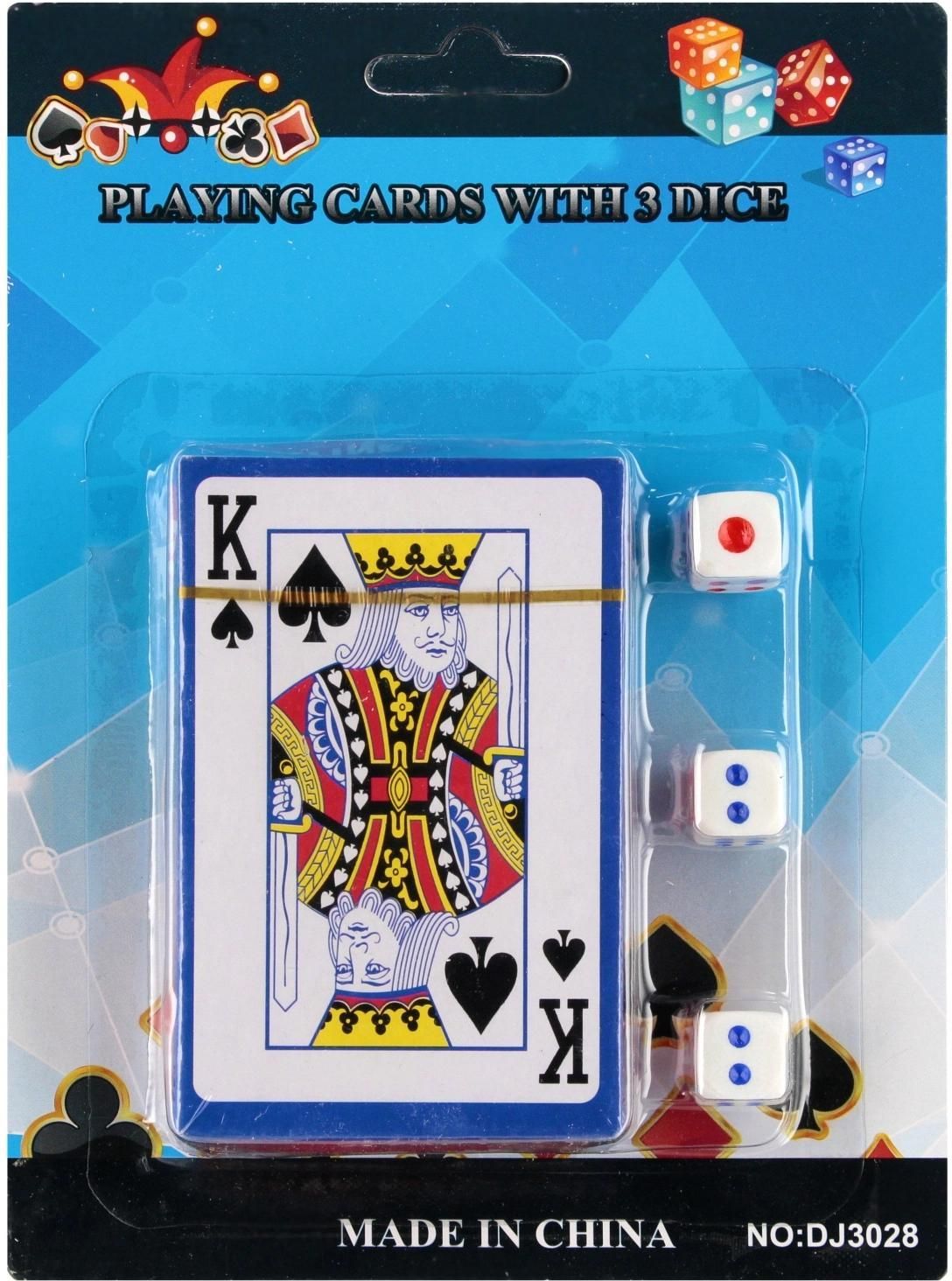 Zalety produktu To klasyczny zestaw który zawiera talię kart oraz komplet kości . Sprawdzą się świetnie dla miłośników zarówno gier karcianych, jak i losowych rzutów kośćmi. Zawartość zestawu talia kart, 3 kostki do gry. Wymiary/waga/baterie wymiary produktu dł. x wys. x gł. cm 6x9x2, wymiary opakowania dł. x wys. x gł. cm 13x17x2, waga produktu w opakowaniu kg 0, 08 kg, nie wymaga zasilania bateriami. Produkt przeznaczony dla dzieci w wieku 3 . Pakowany na blistrze. W kartonie zbiorczym po 240 szt.