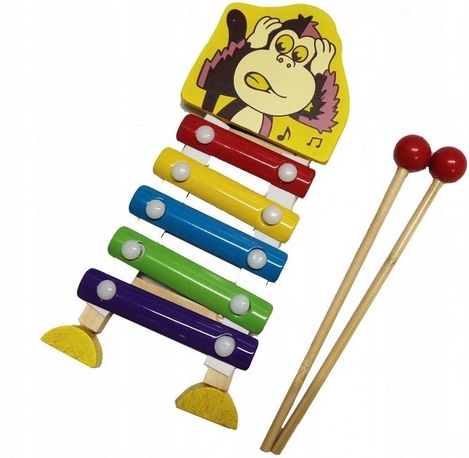 Drewniane cymbałki 5 tonowe - małpka, które pomogą w rozwoju talentu muzycznego niejednego dziecka, pomalowane ekologicznymi i bezpiecznymi farbami. Żywe, radosne kolory sprawią, że dziecko samo będzie chciało na nich grać co będzie miało wpływ na rozwój talentu i słuchu muzycznego u każdego nawet najmłodszego miłośnika muzyki. Produkt wykonany jest z drewna i przeznaczony jest dla dzieci od 2 lat. Wymiary: 18 x 2 x 9 cm do zestawu dołączone są dwie pałeczki o długości 16 cm