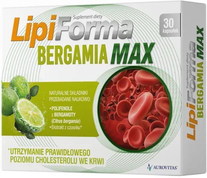 Lipiforma Bergamia Max 30 kapsułek to suplement diety oparty na naturalnych wyciągach. Produkt zawiera ekstrakt z bergamoty, będący źródłem polifenoli, oraz ekstrakt z czosnku. Czosnek wspomaga utrzymanie prawidłowego stężenia cholesterolu we krwi, wspiera zdrowie naczyń krwionośnych, a także przyczynia się do utrzymania prawidłowego poziomu homocysteiny. Ponadto zwiększa odporność organizmu. Lipiforma Bergamia Max kapsułki są wygodne w użyciu i łatwe do połknięcia. Suplement diety Lipiforma Bergamia Max 30 kapsułek dedykowany jest osobom dorosłym.