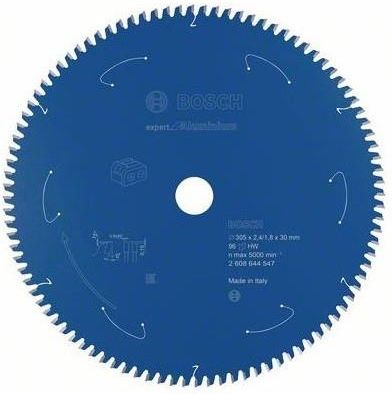 NA AUKCJI OFERUJEMY BOSCH Ostrze do piły tarczowej bezprzewodowej Expert for Wood 305x2,4 mm x 30 T96 (Nr katalogowy 2 608 644 547 / 2608644547) Właściwości techniczne Tarcza pilarska Expert for Aluminium maksymalnie zwiększa czas pracy akumulatora. Ultracienki rzaz zmniejsza tarcie i usuwanie materiału, zużywając mniej mocy do łatwego i płynnego cięcia. Zęby z węglika MicroteQ zapewniają wysoką trwałość i wyjątkową wydajność podczas pracy z metalami nieżelaznymi. Sprawdzi się idealnie w przypadku cięcia aluminium i innych metali nieżelaznych, tworzyw sztucznych, epoksydu, a nawet drewna. Tarcza pasuje do wszystkich popularnych ukośnic bezprzewodowych i przesuwnych pił kątowych. Tarcza pilarska Expert for Aluminium wyposażona jest w zęby MicroteQ, wytwarzane przez firmę Bosch z bardzo drobnego trwałego ziarna węglikowego, które zapewnia niezwykłą żywotność. Tarcza została pokryta powłoką antykorozyjną ProteQtion, która zmniejsza tarcie, zapobiega powstawaniu rdzy i pozwala uzyskać dużą wydajność cięcia i wysoką trwałość. Dane techniczne: Średnica zewnętrzna mm: 305 Otwór mm: 30 Szerokość cięcia (b1) mm / grubość korpusu (b2) mm: 2,4/1,8 Liczba zębów: 96 Maks. prędkość obrotowa (obr./min): 5000 Rezultat cięcia: Bardzo dokładne cięcie
