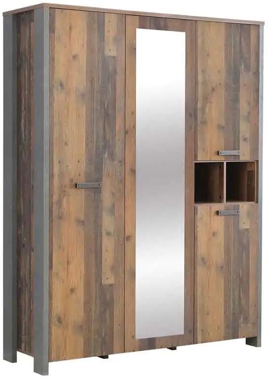 Intrygująca szafa ubraniowa CLIF przyciąga uwagę dzięki takim elementom jak otwarte wnęki na dekoracje czy lustrzany front, który efektownie odbija światło i optycznie powiększa pomieszczenie. Szafa tworzy wygodny w użytkowaniu system przechowywania dzięki dużej liczbie półek i wnęce z drążkiem odzieżowym. Charakteru dodaje jej zaś oryginalne wybarwienie w kolorze ciemnego drewna i betonu. Dlaczego warto wybrać szafę ubraniową CLIF? Szafa na ubrania z półkami z kolekcji mebli Forte CLIFF to mebel z ciekawie zagospodarowanym wnętrzem, wykonany z wysokiej jakości płyty o gładkiej, niewymagającej w pielęgnacji powierzchni. Szafa oferuje użytkownikowi obszerną wnękę z półką i drążkiem odzieżowym, a także dwie otwarte wnęki na dekoracje oraz rząd półek na poukładaną odzież lub obuwie. Drzwiczki mebla są uchylane, a dzięki poręcznym uchwytom z tworzywa użytkownik może korzystać z nich wygodniej, bez pozostawiania śladów na gładkich frontach. Gdzie sprawdzi się szafa z lustrem CLIF? Prezentowana szafa na ubrania z lustrem CLIF wyróżnia się prostą, minimalistyczną bryłą i surową kolorystyką. Mebel został wybarwiony na odcień Old Wood Vintage oraz Beton Ciemnoszary, co idealnie wpisuje go w charakter aranżacji industrialnych. Elegancji całej bryle tej szafy ubraniowej dodaje natomiast lustrzany front, który pomaga również optycznie powiększyć pomieszczenie. Mebel sprawdzi się między innymi w sypialni, garderobie czy w pokoju nastolatka. Wymiary szafy Szerokość: 156,4 cm Głębokość: 52,3 cm Wysokość: 204,7 cm