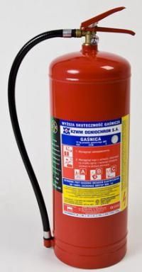 eznaczenie: Gaśnica proszkowa 12 kg ABC znajduje szczególne zastosowanie w magazynach gazów palnych, farb, lakierów i innych cieczy łatwopalnych, halach przemysłowych, warsztatach, garażach oraz w obiektach użyteczności publicznej, zakładach energetycznych i chemicznych, statkach i podziemnych wyrobiskach górniczych. Podstawowe cechy: zbiornik pokryty trwałą powłoką lakierniczą; wskaźnik ciśnienia umożliwiający stałą kontrolę ciśnienia gaśnicy; wąż tworzywowy ułatwiający odpowiednie kierowanie strugą proszku gaśniczego; dozowanie emisji środka gaśniczego poprzez zastosowanie zaworu szybkootwieralnego umożliwiającego czasowe przerwanie wypływu środka gaśniczego; możliwość wyposażenia w łatwy do zamontowania wspornik mocujący; możliwość wielokrotnego napełniania w Autoryzowanych Zakładach Serwisowych; wyższa skuteczność gaśnicza od normatywnej. Gaśnica posiada niezbędne dopuszczenia i certyfikaty. Produkowana jest zgodnie z wymaganiami europejskiej normy EN 3 w oparciu o certyfikowany system jakości ISO 9001. Gaśnicą GP-12x ABC można gasić pożary urządzeń elektrycznych o napięciu do 123 kV (Instytut Energetyki Nr EWN/84/E/07-a). Gaśnica może być stosowana w górnictwie (opinia CSRG nr 32/2008).