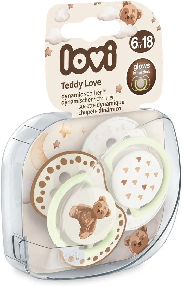 Smoczek Silikonowy Dynamiczny LOVI 2 Sztuki Teddy Love Informacje: Zakres wiekowy: 6-18 miesięcy Materiał gumki: Silikon Kształt gumki: Symetryczny Budowa: Dynamiczna, różna grubość silikonu Element świecący w ciemności: Uchwyt lub kapsel Codzienny spokój, który nadąża za rozwojem Między 6. a 18. miesiącem życia dziecko coraz intensywniej poznaje świat, ale potrzeba wyciszenia wciąż odgrywa ogromną rolę. Dynamiczny smoczek uspokajający lovi Teddy Love 6–18 miesięcy został zaprojektowany tak, aby wspierać malucha na tym etapie – delikatnie uspokajać, a jednocześnie respektować naturalne mechanizmy ssania. To rozwiązanie dla rodziców, którzy chcą połączyć komfort dziecka z troską o jego prawidłowy rozwój. Naturalne ssanie bez kompromisów Dynamiczna konstrukcja gumki z silikonu o różnej grubości sprawia, że smoczek pracuje razem z dzieckiem. Rozciąga się i kurczy zgodnie z rytmem ssania, chroniąc odruch ssania i nie zaburzając karmienia piersią. To subtelna różnica, którą organizm dziecka odczuwa od pierwszego kontaktu. Symetryczny kształt inspirowany brodawką sutkową wypełnioną mlekiem daje dziecku naturalne, znane wrażenia. Ssanie jest spokojne, instynktowne i niewymuszone. Praktyczny również po zmroku Smoczki Teddy Love 6–18 m posiadają uchwyty świecące w ciemności, które ułatwiają ich odnalezienie podczas nocnych pobudek. Dla dzieci w wieku 6–18 miesięcy, które wcześniej korzystały ze standardowego smoczka Lovi 6–18, naturalnym kolejnym etapem jest Teddy Love 18m+ – z tą samą wielkością gumki, ale wzmocnionym silikonem, bardziej odpornym na gryzienie. To płynne przejście dostosowane do rosnącej siły ssania i ząbkujących dziąseł Największe zalety: Skutecznie chroni naturalny odruch ssania Wspiera prawidłowy rozwój mowy i zgryzu (pod warunkiem przestrzegania zaleceń ortodontycznych i neurologopedycznych) Zapobiega odruchowi zagryzania smoczka Jest bardzo lekki i komfortowy Sprawdza się zarówno w dzień, jak i w nocy Świadomy wybór na kolejny etap Lovi Teddy Love 6–18 miesięcy to smoczek, który rozwija się razem z dzieckiem – naturalny, lekki i zaprojektowany z myślą o komforcie oraz bezpieczeństwie na każdym etapie.