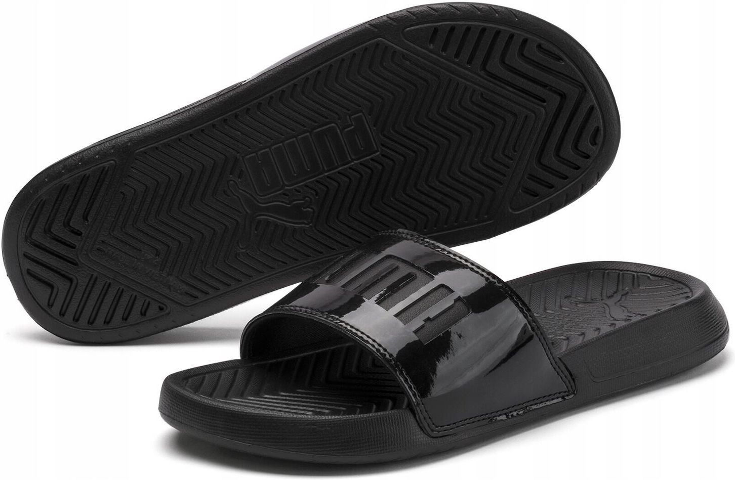 Klapki Puma POPCAT PATENT PUMA Popcat Patent to wyjątkowe klapki, które łączą wygodę z luksusowym stylem, inspirowanym światem wysokiej mody. Ten model wyróżnia się eleganckim paskiem wykonanym z syntetycznej skóry o lakierowanym wykończeniu, co nadaje mu wyrafinowanego charakteru. Odważny branding na pasku podkreśla nowoczesny wygląd klapek, dzięki czemu stanowią one doskonały wybór dla osób, które chcą dodać swoim letnim stylizacjom nuty elegancji i wyrazistości. Popcat Patent został zaprojektowany z myślą o wygodzie. Wyprofilowana wkładka zapewnia miękkość i wsparcie podczas noszenia, co czyni klapki idealnym wyborem na długie, aktywne dni. Podeszwa wykonana z trwałej pianki EVA oferuje doskonałą przyczepność i odporność na ścieranie, dzięki czemu sprawdzą się zarówno na plaży, przy basenie, jak i podczas codziennego użytkowania. Te klapki to nie tylko funkcjonalność, ale również modowy dodatek, który z łatwością uzupełni różnorodne stylizacje. Dzięki połączeniu wyrafinowanego designu z wysoką jakością wykonania, Popcat Patent to propozycja dla osób, które szukają komfortu bez kompromisów w kwestii stylu. Pasek z syntetycznej skóry o błyszczącym, lakierowanym wykończeniu nadaje klapkom elegancki wygląd. Wyprofilowana wkładka zapewnia miękkość i komfort podczas noszenia przez cały dzień. Podeszwa z pianki EVA oferuje trwałość i przyczepność na różnych nawierzchniach. Lekka konstrukcja sprawia, że klapki są idealne na plażę, przy basenie lub do codziennego użytkowania. Pianka EVA to miękki i lekki materiał, odporny na mróz i ścieranie. W teorii najwięcej występuje w butach sportowych, w praktyce występująca we wszystkich jego typach. Ta niepozorna pianka może dać ci odbicie, które dodaje energii z każdym pokonanym kilometrem. Co najważniejsze, pianka EVA zapewni, że nie będziesz przeciążony. Amortyzuje wstrząsy i zapewnia odporność – każdy spacer czy bieg po nierównym terenie nie będzie już dla Ciebie przeszkodą. Główną zaletą tworzyw sztucznych jest ich odporność na ciężkie warunki pogodowe. Są wytrzymałe, nie przepuszczają zimnego powietrza do naszego ciała co czyni je bardzo komfortowymi w mieście jak i terenie, szybko schną, nie uczulają, są odporne na działanie bakterii jak i szkodników domowych (np. moli) więc mogą spędzić dłuższy czas w naszej szafie oraz są bardzo sprężyste.