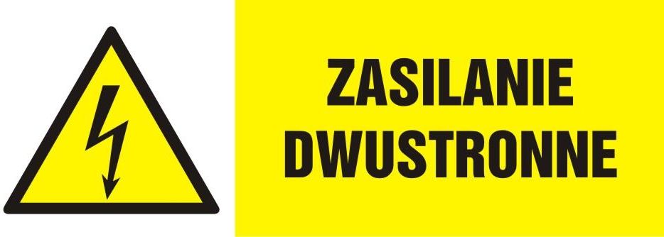 Tablica ostrzegająca przed występowaniem zasilania dwustronnego.Znaki w formatach: DK 21 x 59,4 cm, DU 29,7 x 84,1 cm, FD 42 x 118,9 cm na podłożu p - wykonujemy na płycie sztywnej PCV o grubości 1,5 mm