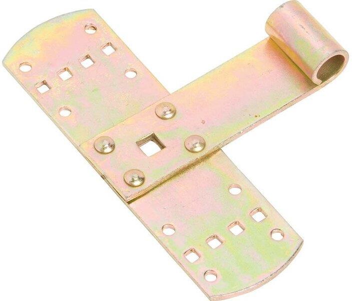 Zawias krzyżowy 50 mm x 165 mm x 13 mmTen ocynkowany na żółto zawias krzyżowy ma wymiary 50 mm x 165 mm / 13 mm. Jedna ze stron przewidziana jest do uchwycenia trzpienia skobla. Druga część służy do zamocowania na drzwiach lub bramie. Ten rodzaj zawiasów zalicza się do kategorii zawiasów pasowych służących do mocowania na drzwiach i bramach. Prawidłowy rozmiar zawiasów zależy od rozmiaru i ciężaru drzwi czy bramy. Za sprawą ocynkowania zawias jest odporny na wpływy atmosferyczne.