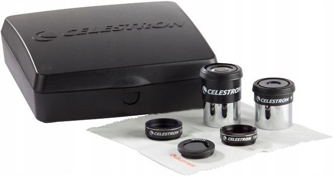 Celestron 94306 – PowerSeeker Eyepiece & Filter Accessory Kit 7-częściowy zestaw akcesoriów do teleskopów • 1,25" okulary • Filtry kolorowe • Futerał Rozszerz możliwości swojego teleskopu dzięki siedmioczęściowemu zestawowi akcesoriów Celestron PowerSeeker. Ten praktyczny komplet zwiększa funkcjonalność modeli PowerSeeker, ale jest również kompatybilny z niemal każdym teleskopem wyposażonym w standardowy wyciąg 1,25". Pełny zestaw 7 akcesoriów W komplecie znajdziesz: 2 okulary Kellner 1,25" – 15 mm (średnia moc) i 9 mm (duża moc) 3 filtry do okularów – filtr księżycowy, czerwony i niebieski Ściereczkę do czyszczenia optyki Twardy futerał z piankowym wnętrzem Okulary Kellner 15 mm i 9 mm Okular 15 mm zapewnia świetną równowagę między powiększeniem a komfortem obserwacji, natomiast 9 mm pozwala przyjrzeć się szczegółom powierzchni planet i Księżyca z większą precyzją. To idealne uzupełnienie podstawowego wyposażenia teleskopu. 3 popularne filtry planetarne Filtr księżycowy – redukuje jasność tarczy Księżyca, poprawiając kontrast i widoczność szczegółów. Filtr czerwony – wzmacnia detale na powierzchni Marsa, podkreślając czapy polarne i zmiany barw. Filtr niebieski – ulepsza obserwację pasów chmur Jowisza oraz pierścieni Saturna. Wytrzymały futerał transportowy Solidny futerał z twardego plastiku i piankowym wypełnieniem zapewnia bezpieczne przechowywanie wszystkich elementów, chroniąc je przed kurzem i uszkodzeniami. Dzięki niemu możesz zabrać akcesoria w teren bez obaw.