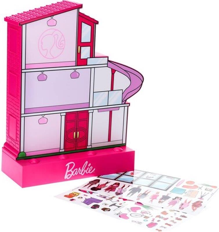 Lampka o wysokości 30 cm, ma kształt domku marzeń Barbie i zawiera cztery przyciski, dzięki którym można oddzielnie podświetlić każde pomieszczenie. W zestawie znajduje się ponad 80 naklejek, które można wielokrotnie używać, umożliwiając personalizację lampki za pomocą lalek Barbie i mebli.