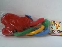 Przestrzenna miękka zabawka w kształcie słonia w kolorze czerwonym. Wyposażona jest w kolorowe obręcze służące do nakładania , bądź rzucania na trąbę słonia. Zabawka dla małych dzieci, rozwija funkcje poznawcze, uczy różnicowania kolorów, doskonali chwyt dziecka i koordynację psycho-ruchową.Przeznaczenie: dzieci w wieku powyżej 18 miesiąca życia.