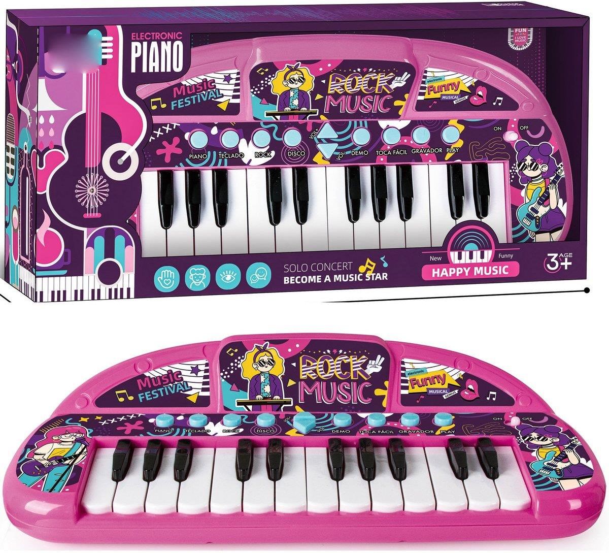 KEYBOARD ORGANY PIANINKO ORGANKI DLA DZIECI EDUKACYJNE ODGŁOSY INTERAKTYWNE Pianinko 24 klawisze Keyboard to rewelacyjny pomysł na prezent dla każdego dziecka, które przejawia zdolności muzyczne i artystyczne i uwielbia występy przed najbliższymi. Zabawką edukacyjna pozwoli rozbudzać pasję muzyczną, ale i też poprawić umiejętności, poczucie rytmu i zmysł słuchu. Dzieci lubią bawić się instrumentami, a zwłaszcza takimi, które są stworzone specjalnie z myślą o nich. Częste ćwiczenia nauczą regularności i na pewno wasze dziecko załapie bakcyla. Zabawa muzyczna i nauka gry na organach pozwoli dzieciom pokochać muzykę podszkolić swoje zacięcie do tego instrumentu oraz tworzyć własne melodie. Prezentowane pianinko posiada 24 klawisze. Pianinko wyróżnia się przyciągającą wzrok fioletową kolorystyką,. Organy wykonano z atestowanego, solidnego tworzywa najwyższej jakości, dzięki czemu nadano im certyfikat CE. Nad miętowymi klawiszami umieszczone jest szereg kolorowych, różnorodnych przycisków, które uruchamiają rewelacyjne efekty i funkcje. Organki posiadają : przycisk demo 3 rodzaje instrumentów 3 rodzaju rytmu regulacja głośności głośnik- piosenki demo Zabawka zasilana bateriami 3 x AA (brak w zestawie) Keyboard zapakowany w kolorowe pudełko idealnie nadaje się na prezent. Wymiary pianinka: 36 cm x 18 cm x 5 cm Wymiary opakowania: 40,5 cm x 19 cm x 8cm