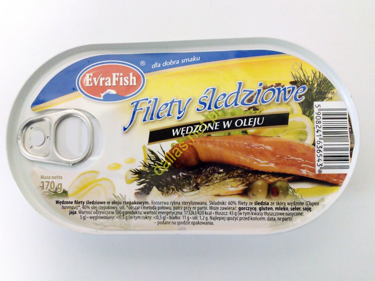 FILETY ŚLEDZIOWE WĘDZONE W OLEJU konserwa EvraFish - 170 g EVRA - FILETY ŚLEDZIOWE WĘDZONE W OLEJU - 170 G Masz ochotę na rybny przysmak? Spróbuj Filetów śledziowych wędzone w oleju EvraFish i przekonaj się, jak smakuje jakość z polskich zakładów! Filety śledziowe wędzone w oleju EvraFish to najwyższej jakości rybny specjał, przygotowany z dodatkiem delikatnego oleju rzepakowego. To wspaniała propozycja na samodzielną potrawę, ciekawą przystawkę lub dodatek do kanapki, sałatki, a nawet pieczonego ziemniaka. Dzięki przemyślanej recepturze i restrykcyjnie selekcjonowanym składnikom Filety śledziowe wędzone w oleju EvraFish są gotowe od razu do jedzenia! Doskonały smak, tradycyjna receptura, naturalne składniki wysokiej jakości. Danie gotowe do podania! Zawsze pod ręką! Klasyk kuchni polskiej. Nie wymaga chłodzenia.. Danie zamknięte w puszce z wieczkiem typu easy open. Nie wymaga otwieracza. Łatwy i wygodny sposób przygotowania. Oszczędność czasu. Poręczne i szczelne opakowanie, które możesz wszędzie zabrać ze sobą. Idealne rozwiązanie w domu, podczas wyprawy czy obozowania przy ognisku. Pozycja wprost obowiązkowa dla miłośników aktywnej turystyki. Nie potrzebujesz lodówki, żeby zabrać je ze sobą! Niewątpliwym plusem konserwy jest to, że nie zepsuje się jak wędlina czy ser, dlatego pakiet zamknięte opakowanie Filetów śledziowych wędzone w oleju + pieczywo da Ci możliwość przygotowania na szybko świeżego posiłku. To poręczne opakowanie z wieczkiem typu easy open otworzysz w każdych warunkach! Możesz je śmiało wrzucić do plecaka - nie odczujesz jego wagi, a będziesz mieć pewność, że po długiej wędrówce zaspokoisz głód i dostarczysz organizmowi energii do kolejnych działań. Nie musisz się też martwić, że konserwa uwolni swoją zawartość do Twojego plecaka. Puszka jest naprawdę solidnie wykonana i niestraszne jej byle wstrząsy - została skonstruowana tak, by zachować szczelność opakowania w różnych warunkach. Szczegółowe informacje Konserwa rybna / Danie w puszce / Konserwa / Żywność konserwowana Potrawa: EXCLUSIVE PASTA VEGE HUMMUS Opakowanie: puszka z wieczkiem typu easy open. Nie wymaga otwieracza. Przechowywanie: w suchym pomieszczeniu w temperaturze od +4°C do +25°C. Spożyć bezpośrednio po otwarciu. Konserwa: konserwa rybna, sterylizowana. Składniki: 60%* filety ze śledzia atlantyckiego ze skórą wędzone (Clupea harengus)*, 40% olej rzepakowy, sól. *obszar i metoda połowu, patrz przy numerze partii. Może zawierać: gorczycę, zboża zawierające gluten (z pszenicy, jęczmienia i owsa), mleko, seler, soję, jaja. Masa netto: 170 g Wartość odżywcza w 100 g produktu: tłuszcz - 43 g, w tym kwasy tłuszczowe nasycone - 5 g, węglowodany - < 0,5 g, w tym cukry - < 0,5 g, białko - 11 g, błonnik - 1,2 g. Wartość energetyczna kJ / 100 g - 1732 kJ kcal / 100 g - 420 kcal EAN13: 5908241636543