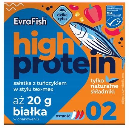 SAŁATKA Z TUŃCZYKIEM w stylu tex-mex HIGH PROTEIN konserwa EVRAFISH - 160 g Masz ochotę na rybny przysmak? Koniecznie spróbuj Sałatki z tuńczykiem w stylu tex-mex EvraFish High Protein i przekonaj się, jak smakuje jakość z polskich zakładów! Doskonałe połączenie świeżego tuńczyka w koncentracie pomidorowym z fasolą, kukurydzą i suszonym chili. Ten najwyższej jakości rybny specjał został przygotowany według tradycyjnego przepisu, dzięki czemu jest niezastąpionym składnikiem sałatek. Dzięki przemyślanej recepturze i restrykcyjnie selekcjonowanym składnikom Sałatka z tuńczykiem w stylu tex-mex EvraFish jest gotowa od razu do jedzenia! Doskonały smak, tradycyjna receptura, naturalne składniki wysokiej jakości. Danie gotowe do podania! Zawsze pod ręką! Niezastąpiony dodatek do sałatek. Danie zamknięte w puszce z wieczkiem typu easy open. Nie wymaga otwieracza. Łatwy i wygodny sposób przygotowania. Produkt High Protein! Sałatka zawiera aż 20 g białka w opakowaniu. Szczegółowe informacje Sałatka rybna / Produkt High Protein / Konserwa / Żywność konserwowana / Opakowanie easy open / EvraFish Produkt: Sałatka z tuńczykiem w stylu tex-mex Masa netto: 160 g Składniki: 26% tuńczyk pasiasty* rozdrobniony, 13,5 fasola czerwona, 12% kukurydza, woda, 10,7% papryka czerwona, olej rzepakowy tłoczony na zimno, nasiona konopi siewnej, soja ziarno, koncentrat pomidorowy, przecier jabłkowy, fasola czarna ziarno, cukier trzcinowy, przyprawy, sól, chili suszone, koncentrat soku cytrynowego, pieprz czarny mielony, ocet spirytusowy, ekstrakty roślinne (groszek, marchewka). Może zawierać: gorczycę, zboża zawierające gluten (z pszenicy, jęczmienia i owsa), mleko, seler i jaja. * Tuńczyk pasiasty [Euthynnus (Katsuwonus Pelamis)] ze zrównoważonych połowów posiadających certyfikat MSC-C-54739. Opakowanie: puszka z wieczkiem typu easy open. Nie wymaga otwieracza. Przechowywanie: w temperaturze od +4°C do +25°C. Spożyć bezpośrednio po otwarciu. Wartość odżywcza w 100 g produktu Wartość energetyczna: 173 kcal Tłuszcz: 9,8 g w tym kwasy tłuszczowe nasycone: 1 g Węglowodany: 6,5 g w tym cukry: 4,9 g Białko: 13 g Sól: 0,72 g