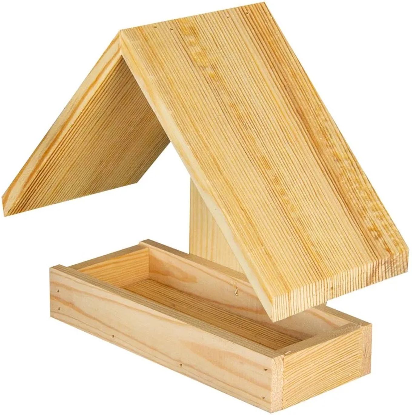 Karmnik dwuspadowy gładki jasny Ten duży, solidnie i starannie wykonany, dwuspadowy karmnik z pewnością stanie się ozdobą tarasów, balkonów i ogrodów. Ułatwia dokarmianie ptaków zimujących w kraju. Umożliwia również obserwację z bliskiej odległości m.in. wróbli, gili czy sikorek.