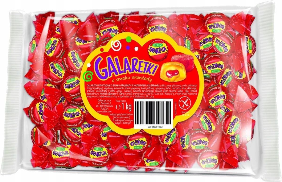 Galaretki o smaku Oranżady Hellena 1kg Ciesz się orzeźwiającym smakiem oranżady z naszą wyjątkową galaretką Hellena! Nasza galaretka o smaku oranżady to idealna przekąska dla miłośników owocowych i orzeźwiających smaków. Znajdziesz w niej soczysty smak orzeźwiającej oranżady, który zachwyci Twoje kubki smakowe i dostarczy Ci niezapomnianych chwil radości. Opakowanie 1kg zapewni Ci mnóstwo pysznej galaretki, którą możesz podać na różnego rodzaju imprezach, przyjęciach czy spotkaniach rodzinnych. Nasza galaretka to doskonały wybór nie tylko na gorące dni, ale także na każdą okazję, gdy pragniesz odświeżającego smaku oranżady. Galaretki o smaku Oranżady Hellena waga: 1kg skład: cukier, syrop glukozowy, woda, substancja żelująca pektyny, regulator kwasowości kwes cytrynowy, kwas jabłkowy, jabłczany sodu, cytryniany sodu, koncentrat soku jabłkowego, aromaty, koncentaty z jabłek, , cytryn, marchwi, krokosza barwierskiego. Produkt zawiera mleko, soję i orzeszki arachidowe. Produkt bezglutenowy.