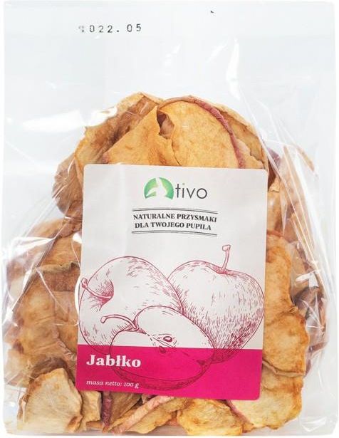 TIVO JABŁKO 100g Suszone jabłko to zdrowa przekąska, którą Twój pupil będzie uwielbiał.Jest prawdziwą bombą witaminową.Zawiera wiele odmian witamin B, które dobrze wpływają na skórę i sierść.Dodatkowo nasze jabłko suszone jest ze skórką co wpływa na zawartość witaminy C, dzięki temu wspomaga układ odpornościowy.Skład:suszone plastry jabłkaAnaliza: Wilgotność: 8%, Popiół: 1,5%, Włókno surowe: 15%