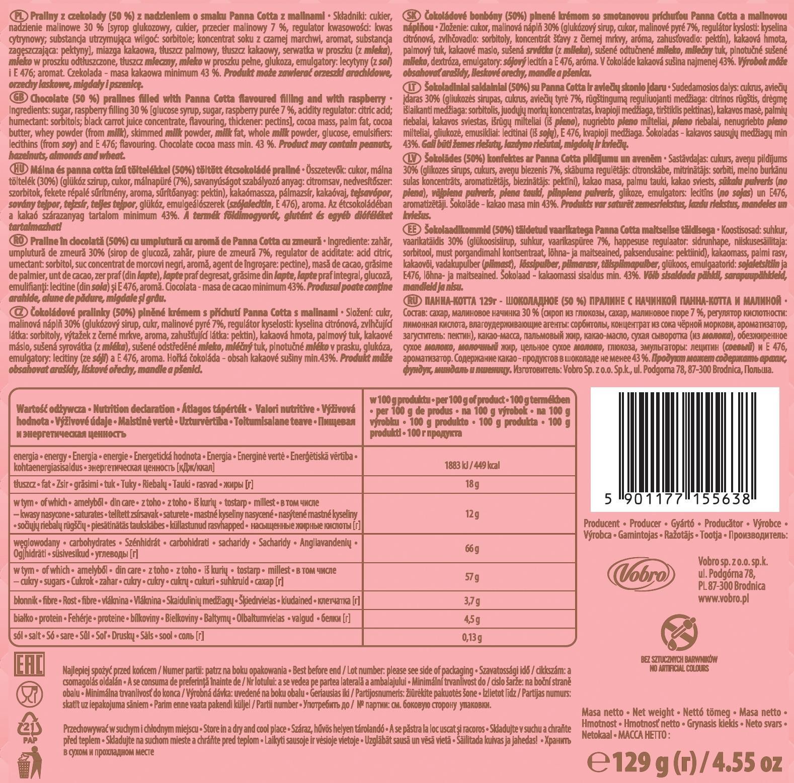 VOBRO PRALINY PANNA COTTA BOMBONIERKA DZIEŃ KOBIET PREZENT 129G Zbliża się Dzień Kobiet, a Ty poszukujesz idealnego upominku? Bombonierka Vobro Pralines Panna Cotta o wadze 129 g to doskonały wybór, który z pewnością zachwyci każdą miłośniczkę słodkości. Te eleganckie praliny łączą w sobie wyrafinowany smak inspirowany włoskim deserem oraz estetyczny wygląd, czyniąc je idealnym prezentem na tę wyjątkową okazję. UWAGA Bombonierki posiadają kartonową osłonkę w dwóch wariantach kolorystycznych- czerwony i złoty. Ze względów logistycznych wysyłane losowo. Dlaczego warto kupić ten produkt? ? Podwójna warstwa nadzienia – każda pralina skrywa w sobie dwie warstwy kremowego nadzienia o smaku panna cotta z dodatkiem soczystej maliny, dostarczając niezapomnianych doznań smakowych. ? Delikatna czekolada deserowa – praliny pokryte są wysokiej jakości czekoladą deserową, która doskonale komponuje się z owocowym wnętrzem. ? Naturalny skład – produkt nie zawiera sztucznych barwników ani konserwantów, co świadczy o jego wysokiej jakości i dbałości o zdrowie konsumentów. ? Eleganckie opakowanie – stylowe pudełko o wadze 129 g prezentuje się luksusowo i jest gotowe do wręczenia jako prezent. ? Idealny upominek – doskonały wybór na Dzień Kobiet, urodziny czy inne wyjątkowe okazje, aby wyrazić swoje uczucia i sprawić radość bliskiej osobie. Podaruj bliskiej osobie chwilę słodkiej przyjemności z bombonierką Vobro Pralines Panna Cotta 129 g. To połączenie doskonałego smaku i elegancji, które z pewnością wywoła uśmiech na twarzy obdarowanej osoby.