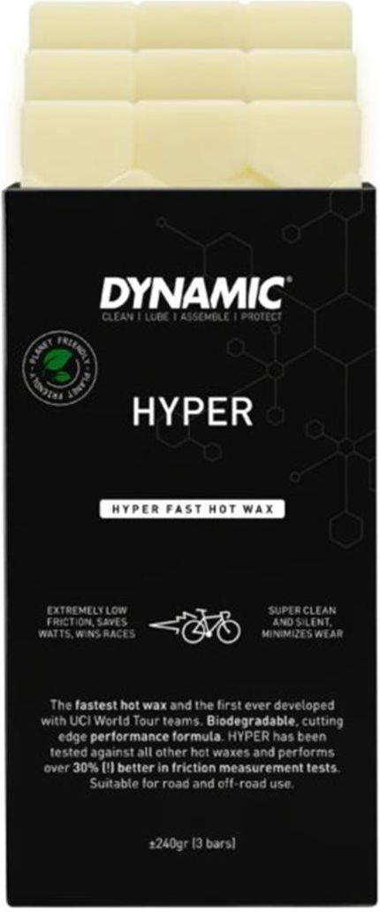 Dynamic wosk na gorąco Hyper Wax Hyper Wax to pierwszy na świecie w pełni biodegradowalny wosk na gorąco, stworzony we współpracy z zespołami UCI World Tour. Dzięki innowacyjnej formule pozbawionej PFAS i innych szkodliwych substancji, zapewnia maksymalną efektywność napędu, bijąc tradycyjne woski na gorąco o ponad 30% w testach laboratoryjnych. Jego zastosowanie pozwala zaoszczędzić 6–12 watów, a optymalizacja formuły sprawia, że sprawdza się zarówno w warunkach laboratoryjnych, jak i rzeczywistych. Najważniejsze cechy Najszybszy wosk na gorąco: Stworzony, by minimalizować straty napędu. Minimalne tarcie: Maksymalna redukcja oporów w napędzie. Czystość i cisza: Napęd pozostaje wolny od brudu i hałasu. Biodegradowalność: Innowacyjna formuła przyjazna środowisku. Współpraca z UCI World Tour: Testowany i rozwijany z najlepszymi Możliwość mieszania z Wander Wax: Łączy cechy szybkości i wytrzymałości. Specyfikacja Zużycie wosku na sesję: Około 4 g na łańcuch o długości 120 ogniw. Trwałość: 400–500 km w trudnych warunkach (MTB/gravel), 700–900 km w normalnych warunkach. Zakres temperatur aplikacji: 75–85°C. Jak używać Hyper Wax? Przygotowanie: Odtłuść i wysusz łańcuch. Roztopienie wosku: Ustaw podgrzewacz na 75–85°C. Aplikacja: Zanurz łańcuch w płynnym wosku na 15 minut, wyjmij, pozwól ostygnąć i oczyść nadmiar mikrofibrą. Jazda: Rozgrzej napęd przez 10 minut. Ponowne woskowanie: Powtarzaj, gdy usłyszysz suchy dźwięk pracy łańcucha. Pytania i odpowiedzi 1. Czy mogę mieszać Hyper i Wander Wax? Tak możesz połączyć Hyper i Wander Wax, aby uzyskać mieszankę optymalną dla Twoich potrzeb. 2. Jaka jest różnica między Hyper Wax a Wander Wax? Hyper Wax: Został zaprojektowany z myślą o maksymalnej prędkości. Jest nieco bardziej miękki, co skutkuje ekstremalnie niskim tarciem, ale może przyciągać więcej brudu. Idealny na przejazdy, gdzie liczy się każda sekunda. Wander Wax: Twardszy od Hyper Wax, mniej podatny na zabrudzenia i bardziej wytrzymały. To najlepszy wybór na dłuższe przejazdy lub jazdę w trudnych warunkach, gdzie wytrzymałość jest kluczowa. Dlaczego wybrać Hyper Wax? Hyper Wax to idealny wybór dla osób, które stawiają na wydajność i prędkość. Jego miększa formuła zapewnia ekstremalnie niskie tarcie, co czyni go idealnym rozwiązaniem na wyścigi, gdzie liczy się każda sekunda. Działa zarówno na szosie, jak i w terenie, w każdych warunkach pogodowych, utrzymując napęd w doskonałej kondycji. Kod producenta: DY-116