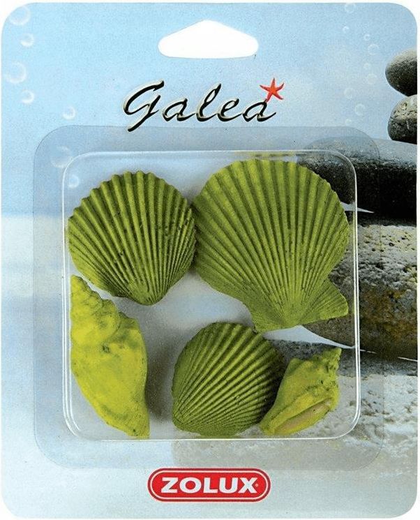 Zolux Ozdoba do Akwarium Galea Kolor muszelek zielony. Liczba sztuk w zestawie: 5 szt Marka: Zolux Stan: nowy długość: 17 szerokość: 14 wysokość: 4 W zestawie 5 muszelek.