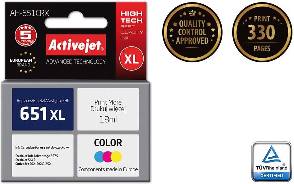 AH-651CRX Tusz do drukarki HP zastępuje tusz HP 651 C2P11AE Kompatybilność HP DeskJet Ink Advantage 5575, HP Deskjet 5645, HP OfficeJet 202, HP OfficeJet 202C, HP OfficeJet 252 Postaw na ekologię Tusz Activejet jest przyjazny środowisku! Przy produkcji postawiono na minimalizację zużycia plastiku i ekologiczne rozwiązania. Dodatkowo, to model regenerowany – po co wyrzucać zużyte tusze, skoro można dać im nowe życie jako pełnoprawny produkt.  Jakość i bezpieczeństwo Tusz Activejet AH-651CRX do HP 651 C2P11AE to pełnoprawny zamiennik do twojej drukarki. Jego użytkowanie nie powoduje utraty lub skrócenia jej gwarancji. Nie napotkasz też żadnych problemów podczas codziennego użytkowania.  Kompatybilność i wygoda Tusz Activejet AH-651CRX do HP 651 C2P11AE  jest wyjątkowo prosty w instalacji. Cały proces nie zajmie Ci więcej niż kilku minut. Nie musisz martwić się o niedopasowane elementy czy zły rozmiar – to produkt stworzony z myślą o twojej drukarce. Postaw na sprawdzone i bezpieczne rozwiązania.  Tchnij drugie życie w swój tusz Wyślij nam zużyty tusz zamiast go wyrzucać. Zamiast trafić na śmietnik otrzyma on drugie życie jako pełnoprawny produkt. Stawiamy na recykling i zrównoważoną gospodarkę odpadami. Nasza planeta jest przecież tylko jedna.  Dane techniczne Pasuje do urządzeń: HP Rodzaj naboju z atramentem: Standardowa wydajność Ilość wkładów z kolorowym tuszem: 1 Pojemność kolorowego tuszu: 18 ml Certyfikaty: ISO 9001, ISO 14001, ISO 27001, ISO 28000 Model: Zamiennik Funkcje techniczne: Cartridge with chip Rodzaj atramentu: Atrament barwnikowy Rodzaj opakowania: Pudełko Wersja: Premium Klasa: A+ Technologia: Regenerowany (odnowiony) Rodzaj dostawy: Jednopak Opis blokowy: Activejet Tusz Kolor: Cyjan, Purpurowy, Żółty Zastępuje: HP 651 Zgodne rodzaje atramentów: 651 C2P11AE Rodzaj tuszu kolorowego: Atrament barwnikowy Wydajność kolorowego tuszu na stronę: 330 stron(y) Eksploatacja kompatybilna: HP 651 C2P11AE EAN: 5901443105855