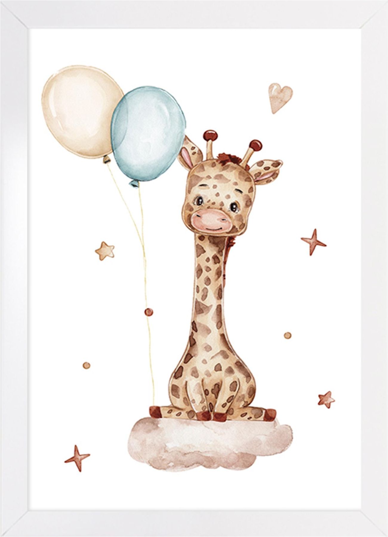 Obraz z żyrafą z balonikami, unoszącym się na puchatej chmurce to doskonała ozdoba do dziecięcego pokoju. Wprowadza przytulny klimat i ciepło, a jednocześnie tworzy piękną przestrzeń do zabawy oraz snu, od początku kształtując w dziecku poczucie estetyki. Obraz LITTLE GIRAFFE – wykonanie Papier z nadrukiem jest umieszczony na solidnym podkładzie z płyty HDF. Prosta biała rama jest wykonana z tworzywa, dlatego obraz jest lekki i można zawiesić go na każdej ścianie. Wnętrze zyska niepowtarzalny urok i wdzięk Rozmiar obrazu: 20x30 cm;