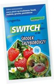 Switch 62,5 WG Preparat o działaniu grzybobójczym, jest koncentratem w postaci granulek, z których sporządza się zawiesinę wodną, działa wgłębnie i kontaktowo, należy stosować zapobiegawczo i interwencyjnie w przypadku zwalczania chorób grzybowych niżej wymienionych roślin. Stosowanie JABŁOŃ Gorzka zgnilizna - zalecana dawka: preparat 7,5g/woda 6l/100m2 Szara pleśń - zalecana dawka: preparat 7,5g/woda 6l/100m2 TRUSKAWKA Szara pleśń - zalecana dawka: preparat 8g/woda 6-8l/100m2 Antraknoza - zalecana dawka: preparat 8g/woda 6-8l/100m2 MALINA Szara pleśń - zalecana dawka: preparat 8-10g/woda 7-10l/100m2 FASOLA SZPARAGOWA Szara pleśń - zalecana dawka: preparat 8-10g/woda 7l/100m2 Zgnilizna twardzikowa - zalecana dawka: preparat 8-10g/woda 7l/100m2 Antraknoza fasoli - zalecana dawka: preparat 8-10g/woda 7l/100m2 GROCH KONSERWOWY Szara pleśń - zalecana dawka: preparat 8-10g/woda 7l/100m2 Zgnilizna twardzikowa - zalecana dawka: preparat 8-10g/woda 7l/100m2 Askochytoza - zalecana dawka: preparat 8-10g/woda 7l/100m2 POMIDOR (w uprawie szklarniowej) Szara pleśń – zalecane stężenie: preparat 0,1% (10g/10l)/ciecz użytkowa 10l/100m2 CZEREŚNIA Brunatna zgnilizna drzew pestkowych - zalecana dawka: preparat 6-10g/woda 6-15l/100m2 WIŚNIA Brunatna zgnilizna drzew pestkowych - zalecana dawka: preparat 6-10g/woda 6-15l/100m2 GRUSZA Szara pleśń - zalecana dawka: preparat 7,5-10g/woda 3-15l/100m2 Gorzka zgnilizna - zalecana dawka: preparat 7,5-10g/woda 3-15l/100m2 Mokra zgnilizna - zalecana dawka: preparat 7,5-10g/woda 3-15l/100m2 Brunatna zgnilizna - zalecana dawka: preparat 7,5-10g/woda 3-15l/100m2 ŚLIWA Brunatna zgnilizna drzew pestkowych - zalecana dawka: preparat 6-10g/woda 6-15l/100m2 MORELA, BRZOSKWINIA, NEKTARYNKA Brunatna zgnilizna drzew pestkowych - zalecana dawka: preparat 6-10g/woda 3-15l/100m2 BORÓWKA AMERYKAŃSKA Szara pleśń - zalecana dawka: preparat 10g/woda 5-20l/100m2 Antraknoza - zalecana dawka: preparat 10g/woda 5-20l/100m2 WINOROŚL Szara pleśń - zalecana dawka: preparat 12g/woda 4-10l/100m2 Zapobieganie infekcjom wtórnych patogenów - zalecana dawka: preparat 12g/woda 4-10l/100m2 PORZECZKA CZARNA, CZERWONA, BIAŁA Szara pleśń - zalecana dawka: preparat 8-10g/woda 7-10l/100m2 zamieranie pędów - zalecana dawka: preparat 8-10g/woda 7-10l/100m2 GROCH KONSERWOWY Zgorzelowa plamistość grochu - zalecana dawka: preparat 8-10g/woda 7l/100m2 Mączniak prawdziwy - zalecana dawka: preparat 8-10g/woda 7l/100m2 POMIDOR (uprawa w gruncie, pod osłonami i w szklarniach) Szara pleśń - zalecana dawka: preparat 10g/woda 10-12l/100m2 Zgnilizna twardzikowa - zalecana dawka: preparat 10g/woda 10-12l/100m2 MARCHEW Szara pleśń - zalecana dawka: preparat 8g/woda 3-10l/100m2 Zgnilizna twardzikowa - zalecana dawka: preparat 8g/woda 3-10l/100m2 Alternarioza - zalecana dawka: preparat 8g/woda 3-10l/100m2 PIETRUSZKA KORZENIOWA Szara pleśń - zalecana dawka: preparat 8g/woda 3-10l/100m2 Zgnilizna twardzikowa - zalecana dawka: preparat 8g/woda 3-10l/100m2 Alternarioza - zalecana dawka: preparat 8g/woda 3-10l/100m2 PASTERNAK Szara pleśń - zalecana dawka: preparat 8g/woda 3-10l/100m2 Zgnilizna twardzikowa - zalecana dawka: preparat 8g/woda 3-10l/100m2 Alternarioza - zalecana dawka: preparat 8g/woda 3-10l/100m2 BURAK ĆWIKŁOWY Szara pleśń - zalecana dawka: preparat 8g/woda 3-10l/100m2 Zgnilizna twardzikowa - zalecana dawka: preparat 8g/woda 3-10l/100m2 Alternarioza - zalecana dawka: preparat 8g/woda 3-10l/100m2 CHRZAN Szara pleśń - zalecana dawka: preparat 8g/woda 3-10l/100m2 Zgnilizna twardzikowa - zalecana dawka: preparat 8g/woda 3-10l/100m2 Alternarioza - zalecana dawka: preparat 8g/woda 3-10l/100m2 BRUKIEW, RZEPA Szara pleśń - zalecana dawka: preparat 8g/woda 3-10l/100m2 Zgnilizna twardzikowa - zalecana dawka: preparat 8g/woda 3-10l/100m2 Alternarioza - zalecana dawka: preparat 8g/woda 3-10l/100m2 CEBULA, SZALOTKA Szara pleśń - zalecana dawka: preparat 10g/woda 3-10l/100m2 Zgnilizna twardzikowa - zalecana dawka: preparat 10g/woda 3-10l/100m2 Zgnilizna szyjki cebuli - zalecana dawka: preparat 10g/woda 3-10l/100m2 CZOSNEK Szara pleśń - zalecana dawka: preparat 10g/woda 3-10l/100m2 Zgnilizna twardzikowa - zalecana dawka: preparat 10g/woda 3-10l/100m2 Zgnilizna szyjki cebuli - zalecana dawka: preparat 10g/woda 3-10l/100m2 OGÓREK (uprawa w gruncie, pod osłonami i w szklarniach) Szara pleśń - zalecana dawka: preparat 10g/woda 2-15l/100m2 Zgnilizna twardzikowa - zalecana dawka: preparat 10g/woda 2-15l/100m2 CUKINIA (uprawa w gruncie, pod osłonami i w szklarniach) Szara pleśń - zalecana dawka: preparat 10g/woda 2-15l/100m2 Zgnilizna twardzikowa - zalecana dawka: preparat 10g/woda 2-15l/100m2 PAPRYKA (uprawa w gruncie, pod osłonami i w szklarniach) Szara pleśń - zalecana dawka: preparat 10g/woda 8-15l/100m2 Zgnilizna twardzikowa - zalecana dawka: preparat 10g/woda 8-15l/100m2 BAKŁAŻAN (uprawa w gruncie, pod osłonami i w szklarniach) Szara pleśń - zalecana dawka: preparat 10g/woda 8-15l/100m2 Zgnilizna twardzikowa - zalecana dawka: preparat 10g/woda 8-15l/100m2 SAŁATA (uprawa w gruncie, pod osłonami i w szklarniach) Szara pleśń - zalecana dawka: preparat 6g/woda 3-10l/100m2 Zgnilizna twardzikowa - zalecana dawka: preparat 6g/woda 3-10l/100m2 ZIOŁA (uprawa w gruncie, pod osłonami i w szklarniach) Szara pleśń - zalecana dawka: preparat 6g/woda 3-10l/100m2 Zgnilizna twardzikowa - zalecana dawka: preparat 6g/woda 3-10l/100m2 ROŚLINY OZDOBNE (uprawiane w gruncie, pod osłonami i w szklarniach) Szara pleśń - zalecana dawka: preparat 10g/woda 5-12l/100m2 Zapobieganie infekcjom wtórnych patogenów - zalecana dawka: preparat 10g/woda 5-12l/100m2 Zamieranie pędów i kwiatów powodowanych przez brunatną zgniliznę drzew pestkowych - zalecana dawka: preparat 10g/woda 5-12l/100m2 SZKÓŁKI DRZEW OZDOBNYVCH I OWOCOWYCH Szara pleśń - zalecana dawka: preparat 10g/woda 5-12l/100m2 Zapobieganie infekcjom wtórnych patogenów - zalecana dawka: prep