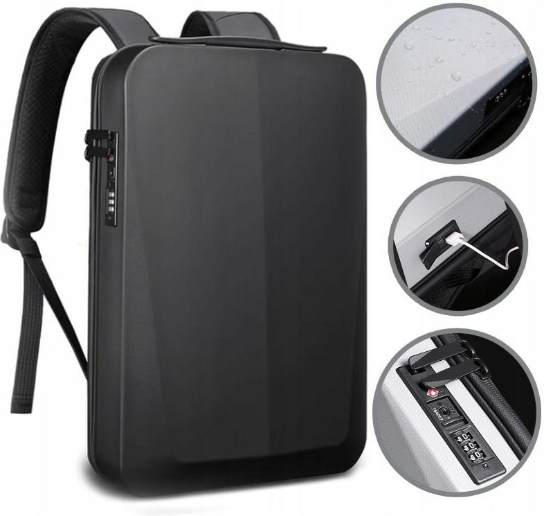 Multifunkcyjny plecak biznesowy BANGE na laptopa REWELACYJNY DESIGN / WYSOKA JAKOŚĆ / INNOWACYJNE ROZWIĄZANIA Styl biznesowy Duża pojemność Przenoś laptopa, tableta i wszystkie swoje rzeczy w jednym, stylowym plecaku! Nie martw się o ich bezpieczeństwo - system antykradzieżowy oraz wodoodporny i wytrzymały materiał Ci je zapewnią! Casualowy design Ergonomiczna, przemyślana konstrukcja pozwoli Ci szybko i sprawnie spakować wszystkie Twoje rzeczy. SLIM - tylko 8 cm głębokości Plecak ? Walizka ? Konstrukcja skorupowa plecaka oparta na materiale EVA sprawia, że wygląda on jak walizka - jest w całości usztywniony. Absolutnie bezkonkurencyjny stosunek jakości do ceny. Kolor: CZARNY Plecak BANGE to najnowsze rozwiązanie na rynku cechujące się połączeniem modnego designu z praktycznymi funkcjami. Elegancki, biznesowy design Szeroki kąt otwarcia plecaka - do 180 stopni! Zewnętrzny port USB System antywłamaniowy TSA lock Wyjątkowe zagospodarowanie przestrzeni Podwójny zamek wysokiej jakości Kieszeń na cenne przedmioty Wysoka wodoodporność i wytrzymałość Ergonomiczny kształt Specyfikacja: Wymiary: 45 x 30 x 8 cm Waga: 1,2 kg Materiał: EVA - wodooporna, twarda powłoka POJEMNOŚĆ Świetnie zaprojektowana przestrzeń pozwala na ulokowanie wiele różnych rzeczy, w tym laptopa do 15,6" oraz tablet - zapinane na elastyczny pasek z rzepem. Wydzielona została również kieszeń z szybkim dostępem, np. na telefon, po dwie kieszenie na drobiazgi i akcesoria, typu powerbank. Ergonomia Na górze plecaka znajduje się uchwyt do przenoszenia plecaka, a dzięki jego niewielkiej wadzeoraz możliwości dopasowania pasów przenoszenie Twoich rzeczy będzie przyjemne. Tył plecaka wyłożono oddychającymi, grubymi gąbkami, aby był wygodny przy dłuższym noszeniu Walizka na laptopa Konstrukcja skorupowa plecaka oparta na materiale EVA sprawia, że wygląda on jak walizka - jest w całości usztywniony. Gwarantuje to zarówno wyjątkowy design, jak i ochronę przed wstrząsami i uderzeniami. Zewnętrzny port USB Plecak BANGE posiada wbudowany, zewnętrzny port USB. Podpinając do niego powerbank, który schowasz w środku, naładujesz swój telefon, jednocześnie korzystając z niego. Uwaga: telefon i powerbank nie są w zestawie z plecakiem. System antykradzieżowy - TSA lock Plecak wyposażony jest w system antykradzieżowy. Główna komora może zostać zabezpieczona przed otwarciem, za pomocą kłódki wyposażonej w trzycyfrowy kod. Materiał Wykonany z wodoodpornego i wytrzymałego materiału EVA, dzięki któremu bez problemu możesz go użytkować w czasie deszczu. Plecak w całości jest usztywniany, dzięki czemu doskonale chroni zawartość przed uderzeniami. Oddychająca tkanina Zarówno tył plecaka jak i szelki wyłożone zostały oddychającymi, miękkimi gąbkami, co podwyższa komfort użytkowania nawet przy dużym obciążeniu. Kąt otwarcia do 180 stopni Plecak można otworzyć pod kątem 30 (zapięcie zabezpieczające na zatrzaski), 90 lub 180 stopni (jak walizkę).