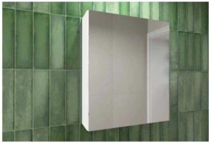 Szafka łazienkowa wisząca z drzwiami + lustro. Front mebla wykonano z wytrzymałej płyty MDF, natomiast korpus z wysokiej jakości płyty laminowanej. Korpus oraz fronty zostały precyzyjnie polakierowane od wewnątrz i od zewnątrz przy pomocy lakieru UVProtect, dzięki czemu cały mebel zyskał znakomitą odporność na promieniowanie słoneczne oraz warunki panujące w łazience. Fronty zostały zacięte pod kątem 45 stopni, dzięki czemu pełnią rolę wygodnych minimalistycznych uchwytów. Dwie półki szklane. Dwie regulowane zawieszki metalowe. Produkt do samodzielnego montażu. Kolor: biały połysk. 2-letnia gwarancja.