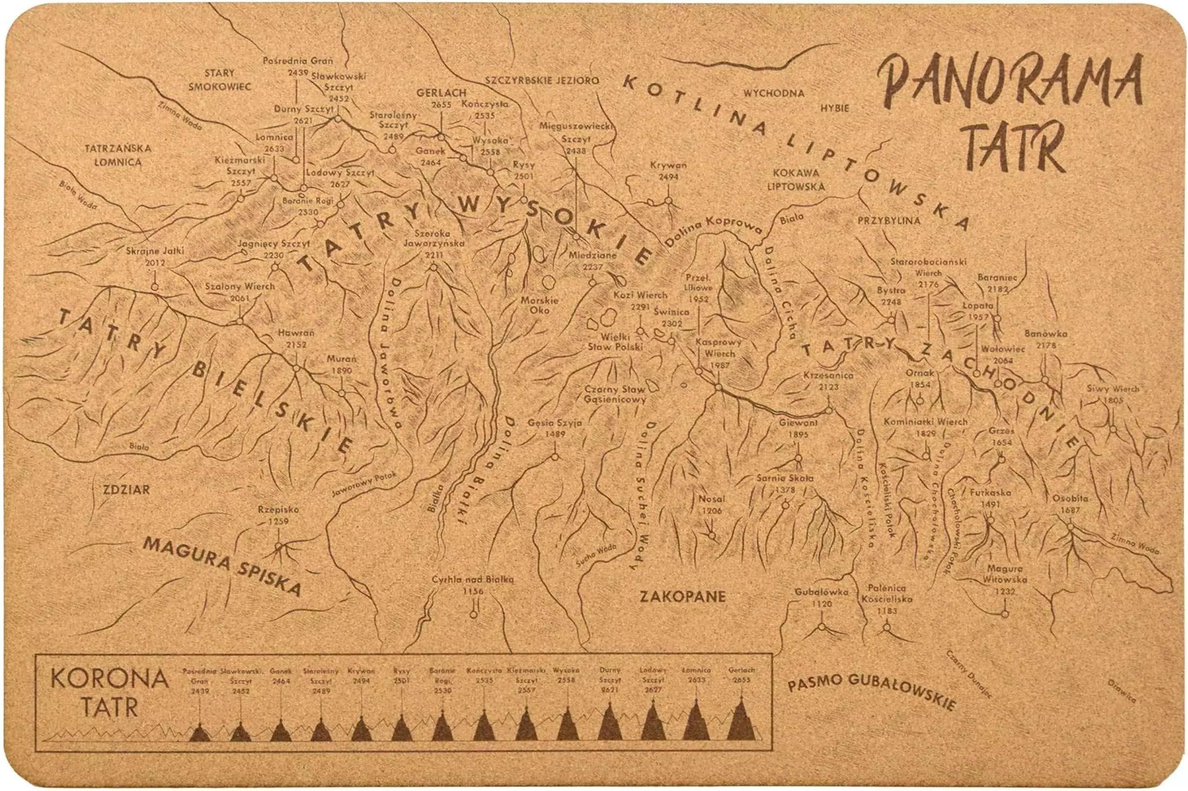 Panorama Tatr o wymiarach 60×40 cm - tablica na ścianę do wpinania znaczników.Mapa została wykonana z najwyższą starannością i dbałością o każdy detal. Dzięki precyzyjnemu, laserowemu grawerowi wszystkie elementy są wyraźne i estetyczne, co zapewnia komfortowe użytkowanie. Starannie zaprojektowana infografika nie tylko przyciąga wzrok, ale również stanowi stylowy i praktyczny dodatek do wnętrza.Najważniejsze cechy: Wysokiej jakości korek – możliwość wielokrotnego przypinania znaczników Laserowy grawer – wyraźne i trwałe oznaczenia Wymiary 60×40 cm – praktyczny format pasujący do każdego wnętrza Oryginalna dekoracja ścienna - nadająca wnętrzu podróżniczy charakter Zestaw znaczników z drewnianymi główkami – w komplecie Mapa to nie tylko źródło informacji o tatrzańskich szczytach, ale także piękny sposób na utrwalenie wspomnień z górskich wędrówek. Na tablicy znajdziesz wierzchołki Korony Tatr, 14 najwybitniejszych szczytów w Polsce. Możesz zaznaczać zdobyte szczyty, planować kolejne wyprawy i śledzić swoje postępy. Podejmiesz górskie wyzwanie i zaznaczysz je wszystkie na mapie?Powierzchnia mapy jest wykonana z wysokogatunkowego korka, pozwala na wielokrotne zaznaczanie odwiedzonych miejsc bez ryzyka uszkodzenia powierzchni. W komplecie znajduje się 28 szt. znaczników z drewnianymi główkami, które doskonale komponują się z naturalnym wyglądem tablicy to stylowe i funkcjonalne akcesoria.Tablica Panorama Tatr to idealny sposób, by zachować ślady z górskich wypraw i codziennie motywować się do zdobywania kolejnych szczytów!