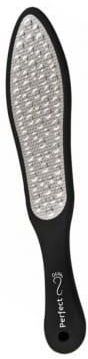 Tarka do stóp ze stali nierdzewnej "Perfect Feet" Tarka do stóp wykonana z hipoalergicznej stali nierdzewnej. Charakteryzuje się wysoką trwałością i jest łatwa w czyszczeniu. Tarka jest dwustronna. Posiada dwie różne gradacje dla uzyskania perfekcyjnego efektu. Czarny estetycznie wykonany uchwyt dobrze trzyma się dłoni.