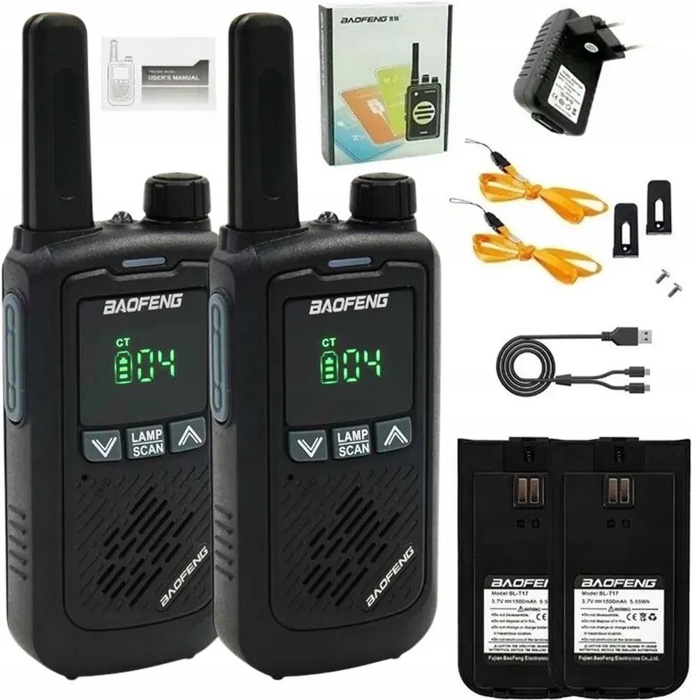 ZESTAW 2x BAOFENG BF-T17 – KRÓTKOFALÓWKI PMR Nowe | Gotowe do użycia | Legalne w UE | Zasięg nawet do 3 km Opis produktu Oferujemy zestaw dwóch nowoczesnych krótkofalówek Baofeng BF-T17, idealnych do komunikacji w każdych warunkach – bez konieczności licencji! Niewielkie, poręczne i bardzo funkcjonalne – sprawdzą się zarówno podczas zabawy, jak i profesjonalnego użytku. Najważniejsze zalety Pasmo PMR446 – bezpłatne i legalne w całej Unii Europejskiej Wbudowany akumulator 1500 mAh – długi czas pracy na jednym ładowaniu (do 24h w czuwaniu) Ładowanie przez USB-C – wygodne i szybkie, także z powerbanka! 16 kanałów PMR – z funkcją szybkiego parowania Funkcja VOX (nadawanie bez naciskania przycisku) – idealna przy zajętych rękach Blokada klawiatury i kanałów – chroni przed przypadkowym przełączeniem Latarka LED wbudowana – awaryjne źródło światła Regulacja głośności i sygnał wywołania Klips do paska i smycz – komfort noszenia Zastosowania krótkofalówek Baofeng BF-T17 Turystyka i biwakowanie – idealne w górach, lasach, na spływach Zabawa dzieci i młodzieży – bezpieczna komunikacja na podwórku lub placu zabaw Budowy i magazyny – szybki kontakt między pracownikami Rajdy, zloty, off-road – niezawodny kontakt między pojazdami Wędkarstwo i polowania – cicha, dyskretna komunikacja Eventy, imprezy plenerowe – sprawna organizacja zespołu Kontakt na posesji lub osiedlu – np. między domem a ogrodem Zestaw zawiera 2x krótkofalówka Baofeng BF-T17 2x akumulator 1500 mAh 2x przewód USB-C 2x klips do paska 2x smycz Instrukcja obsługi (EN) Oryginalne opakowanie Specyfikacja techniczna Pasmo: PMR446 (16 kanałów) Zasięg: do 3 km (teren otwarty) VOX: 3 poziomy czułości Bateria: Li-ion 1500 mAh Latarka LED: TAK Złącze ładowania: USB-C Wymiary: ok. 11 x 5 x 2,5 cm Waga: ok. 120 g (z baterią)