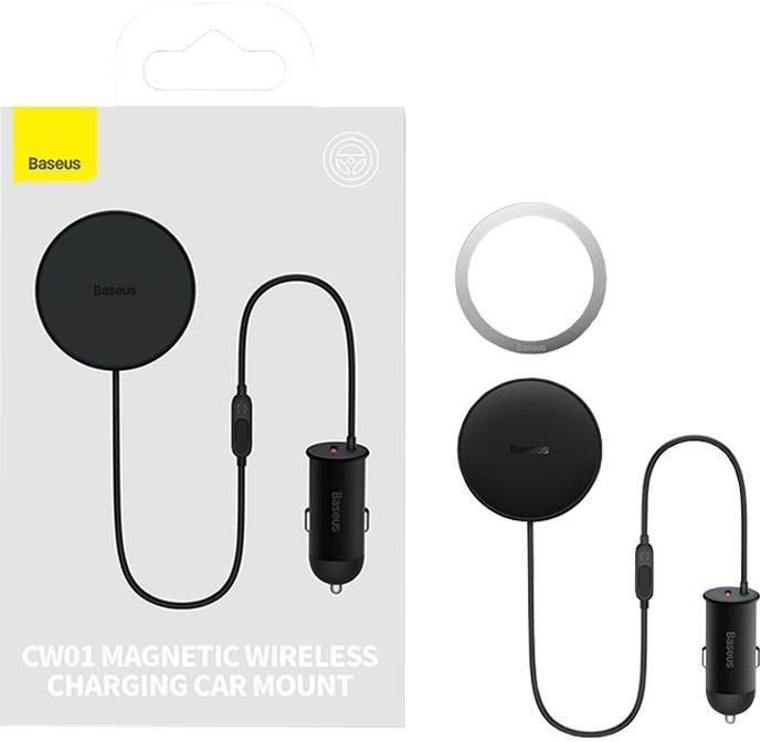 Magnetyczny uchwyt samochodowy Baseus CW01 do kratki z ładowarką USB, 15W + 25W (czarny) Baseus CW01 to połączenie ładowarki samochodowej i praktycznego uchwytu magnetycznego, niezbędnego w czasie jazdy. Z jej pomocą łatwo naładujesz swojego iPhone’a, bez konieczności wyłączania nawigacji, czy odtwarzacza muzyki. Ładowarka obsługuje szybkie ładowanie o łącznej mocy do 40W i automatycznie dostosowuje ją do podłączonych urządzeń, zapewniając im bezpieczeństwo. Produkt wyróżnia się przyjemnym oświetleniem, a jego montaż i obsługa są dziecinnie łatwe. Specyfikacja Nazwa produktu: Magnetyczny uchwyt samochodowy Baseus Model: CW01 Kod producenta: C40141000111-01 Kolor: czarny Materiał: ABS + PC + silikon Długość: 1,2 m Efekt oświetlenia: Lodowy błękit Napięcie wejściowe: DC 12V 24V Moc znamionowa: 40W (15W + 25W) Wyjście ładowania bezprzewodowego: 5W/7.5W/10W/15W max Miejsce instalacji: Kratka wentylacyjna Szybkie ładowanie magnetyczne Solidny magnes, w który została wyposażona ładowarka, obsługuje ładowanie MagSafe, a jego moc szczytowa wynosi 15W. Gwarantuje stabilne połączenie, bez zakłóceń, dzięki czemu nie tylko łatwo naładujesz swój telefon, ale też z powodzeniem wykorzystasz CW01 jako uchwyt samochodowy w każdych okolicznościach. Łatwy montaż Ładowarka zasilana jest za pomocą gniazda zapalniczki, a magnetyczny uchwyt łatwo zamontujesz na kratce wentylacyjnej. Wbudowany pilot sterujący umożliwia ręczne włączenie/wyłączenie zasilania. Co więcej, pierścień magnetyczny oferuje nastrojowe, niebieskie światło, dzięki czemu bez problemu znajdziesz go również po zmroku i szybko podłączysz swój telefon. Praktyczny uchwyt Niezwykła siła magnesu pozwala uchwycić telefon i zapewnić mu bezpieczeństwo w czasie jazdy. Możesz więc wygodnie korzystać z nawigacji lub odtwarzacza muzyki, nie martwiąc się, że telefon się uszkodzi. Gdy Twój telefon osiągnie pełen poziom naładowania, ładowarka automatycznie przestaje podawać moc. Możesz nadal korzystać z uchwytu bez obaw o przeładowanie swojego iPhone’a. Co więcej, uchwyt umożliwia regulację w zakresie 360°, co oznacza, że ustawisz telefon w pozycji wertykalnej lub horyzontalnej. Wybór należy do Ciebie! Szeroka kompatybilność Produkt został zaprojektowany z myślą o telefonach iPhone z serii 12-14, dlatego nie musisz obawiać się o zgodność z systemem, czy niestabilne połączenie. Co więcej, gniazdo ładowarki oferuje uniwersalny port USB-A, dzięki któremu możesz naładować dodatkowe, dowolne urządzenie. Włącznik ładowania bezprzewodowego Dzięki wbudowanemu włącznikowi ładowarki indukcyjnej ty decydujesz kiedy twoje urządzenie jest ładowane