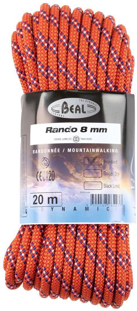 Ten opis został przetłumaczony maszynowo z oryginalnego tekstu. Lekka i cienka lina podwójna o średnicy 8 mm, certyfikowana wyłącznie jako lina podwójna. W przypadku użycia pojedynczej żyły zabronione jest używanie jej do wspinaczki sportowej i alpinizmu. Rando w wersji Classic jest bez impregnacji i nadaje się do wspinaczki w górach lub do asekuracji na bardziej wymagających odcinkach. Rando jest dostępne w podstawowych długościach 20, 30 i 48 m, z 12-metrowymi znacznikami ułatwiającymi zakładanie lub umieszczanie węzłów hamujących. Cechy Certyfikowana jako lina podwójna Niska waga Brak impregnacji Zastosowanie: Wspinaczka górska, turystyka piesza, Via Ferrata Parametry: Lina podwójnaCertyfikatEN 892Siła uderzenia ( laboratorium UIAA ) 7,6 - 7,9 kNSiła uderzenia (gwarantowana przez producenta) 8,5 kNLiczba odpadnięć (laboratorium UIAA) 12Liczba odpadnięć (gwarantowana przez producenta) 12Dynamika przy pierwszym odpadnięciu36 %Wydłużenie statyczne (80 kg) 8,0 %Liczba zwojów w oplocie32Waga / metr36 gPadnięcie na ostrą krawędź-