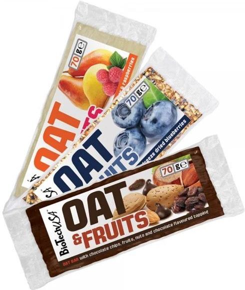 Właściwości Biotech USA Oat&Fruits 70g PRZEKASKA OWSIANA: Dostarcza błonnik Przyspiesza regenerację zasobów glikogenu mięśniowego Zapewnia zrównoważony dopływ energii Zawiera najwyższej jakości złożone węglowodany Oat&Fruits 70g od Biotech USA – przekąska na bazie węglowodanów złożonych przyspieszająca regenerację po wysiłku! Biotech USA Oat&Fruits to smaczne ciasto owsiane dla sportowców, którzy ze względu na duże obciążenie fizyczne potrzebują wysokiej jakości węglowodanów. Przekąska oparta jest na węglowodanach złożonych pochodzących z owsa oraz na zdrowych owocach. Biotech USA Oat&Fruits stanowi alternatywę dla słodyczy - to pełnowartościowa przekąska, którą można spożywać nawet w trakcie odchudzania. Ze względu na zawartość owsa, Biotech USA Oat&Fruits składa się z powoli trawionych węglowodanów. Wśród jego składników znajduje się również fruktoza – cukier pochodzący z kawałków owoców. Dawkowanie Oat&Fruit Biotech USA 70g: W zależności od indywidualnego zapotrzebowania. Składniki Oat&Fruit Biotech USA 70g: Wielkość opakowania: 70g Wielkość porcji: 70g Ilość porcji w opakowaniu: 1 jogurt gruszkowy i malinowy: OAT&FRUITS Baton owsiany z kawałkami gruszki i maliny w polewie jogurtowej SKŁADNIKI: owies (29%), polewa jogurtowa (26%) [cukier,nie-uwodornione oleje roślinne (olej palmowy, olej z ziaren palmowych, olej shea), odtłuszczony jogurt w proszku, serwatka w proszku,laktoza, kwas (kwas cytrynowy), emulgator (lecytyna sojowa), aromat], margaryna [nie-uwodornione oleje roślinne (olej palmowy, olej rzepakowy,olej z orzecha kokosowego, stearyna palmowa), woda, sól], syrop z cukru inwertowanego, cukier trzcinowy, gruszka (3,5%), substancjeutrzymujące wilgoć (gliceryna), mąka sojowa, mrożone suszone maliny (0,4%), aromat. Zawiera gluten, soje, mleko. Może zawierać śladowe ilościorzechów i ziarno sezamowe. rodzynki i orzeszki ziemne z polewą czekoladową: OAT&FRUITS Baton owsiany w polewie czekoladowej z kawałkami czekolady, rodzynkami i orzechami. SKŁADNIKI: owies (30%),margaryna [nie-uwodornione oleje roślinne (olej palmowy, olej rzepakowy, olej z orzecha kokosowego, stearyna palmowa), woda, sól], syropz cukru inwertowanego, polewa o smaku czekoladowym (18%) [cukier, pełni utwardzony tłuszcz roślinny (olej palmowy), kakao w proszku oniskiej zawartości tłuszczu, emulgator (lecytyna sojowa, E476), aromat)], cukier trzcinowy, kawałki czekolady (6%), orzech (3%), rodzynki (3%),migdały (2%), substancje utrzymujące wilgoć (gliceryna), mąka sojowa. Zawiera gluten, soje, mleko, orzechy. Może zawierać śladowe ilości orzechówi ziarno sezamowe. żurawina: OAT&FRUITS Baton owsiany z jagodami. SKŁADNIKI: owies (42%), margaryna [nie-uwodornione oleje roślinne (olej palmowy,olej rzepakowy, olej z orzecha kokosowego, stearyna palmowa), woda, sól], syrop z cukru inwertowanego, cukier trzcinowy,kawałki jagód (4,5%), substancje utrzymujące wilgoć (gliceryna), mąka sojowa, mrożone suszone jagody (0,5%), aromat.Zawiera gluten, soje, mleko. Może zawierać śladowe ilości orzechów i ziarno sezamowe. czekolada-banan: OAT&FRUIT Baton owsiany o smaku bananowym w polewie czekoladowej z kawałkami banana SKŁADNIKI: płatkiowsiane (33%), polewa o smaku czekoladowym (17%) [sacharoza, w pełni uwodorniony tłuszcz roślinny (palmowy),kakao o obniżonej zawartości tłuszczu w proszku, emulgator (lecytyny (soja))], margaryna [oleje roślinne (palmowy,rzepakowy)], inwertowany syrop cukrowy, cukier trzcinowy, kawałki suszonego banana (4%), substancja utrzymującawilgoć (glicerol), mąka sojowa, aromaty. Możliwa obecność orzeszków ziemnych, orzechów i nasion sezamu. jogurt kokosowy: OAT&FRUIT Baton owsiany o smaku kokosowym w polewie jogurtowej z wiórkami kokosowymi. SKŁADNIKI: płatki owsiane (32%),polewa o smaku jogurtowym (21%) [sacharoza, w pełni i częściowo uwodorniony tłuszcz roślinny (palmowy), odtłuszczony jogurt wproszku (mleko), serwatka w proszku (mleko), emulgator (lecytyny), aromat naturalny], margaryna [oleje roślinne (palmowy, rzepakowy)],inwertowany syrop cukrowy, cukier trzcinowy, wiórki kokosowe (3%), substancja utrzymująca wilgoć (glicerol), mąka sojowa,aromat. Możliwa obecność orzeszków ziemnych, orzechów i nasion sezamu. Zawartość Na 70 g % RWS* Na 100 g % RWS* Wartość Energetyczna (energia) 1395 kJ / 333 kcal 17% 1993 kJ / 475 kcal 24% Tłuszcz 17 g 24% 25 g 35% w tym kwasy tłuszczowe nasycone 10 g 50% 14 g 72% Węglowodany 41 g 16% 58 g 22% w tym cukry 21 g 23% 30 g 33% Błonnik 1.9 g - 2.7 g - Białko 3.8 g 8% 5.5 g 11% Sól 0.17 g 3% 0.24 g 4% %RWS – referencyjna wartość spożycia
