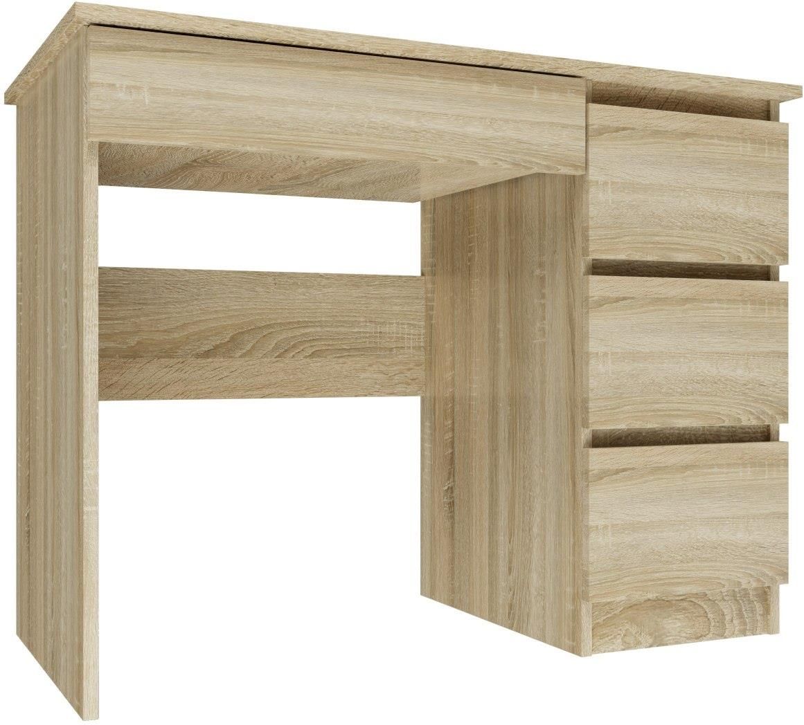 WYMIARY: Głębokość: 51 cm Szerokość: 98 cm Wysokość: 76 cm FUNKCJONALNE BIURKO Z 4 SZUFLADAMI MODEL "MIJAS PRAWE" KOLOR: DĄB SONOMA BIURKO model "MIJAS" świetnie sprawdzi się w domowych pokojach jak i w biurze. idealne miejsce na laptopa fronty bez uchwytów 3 pojemne wysokie szuflady z lewej strony …