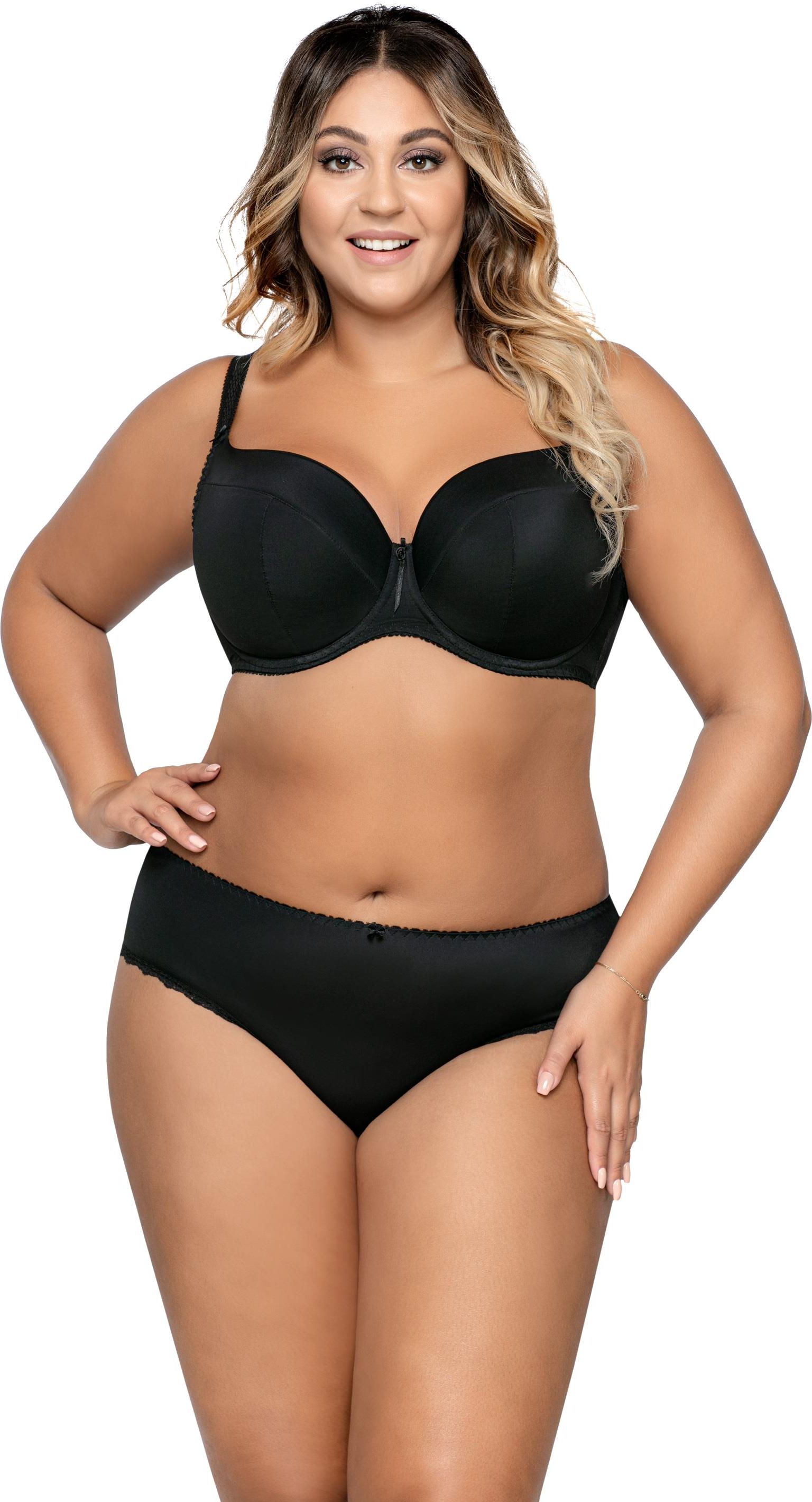 Klasyczny gładki full cup, który zachwyca doskonałą konstrukcją. Biustonosz z wysokim mostkiem w całości wykonany jest z delikatnej mirofibry, miękkiej pianki i przyjemnej bawełny. Pełne miseczki dokładnie okalają biust i unoszą, co pozwala uzyskać kuszący dekolt. Plecy dzięki elastycznej dzianinie z domieszką lycry doskonale dopasowują się do ciała i pozwalają utrzymać biustonosz w odpowiednim miejscu. Do kompletu polecamy figilub brazyliany 1263. Skład: 88% Poliamid, 8% Bawełna, 4% Elastan Typ: full cup Kolor: czarny Konstrukcja: full cup painel (K-924) Ramiączka: nieodpinane / regulowane z metalowym, powlekanym, antyalergicznym regulatorem Zapięcie: dwurzędowa / trzyrzędowa, trzystopniowa haftka Fiszbiny boczne: tak