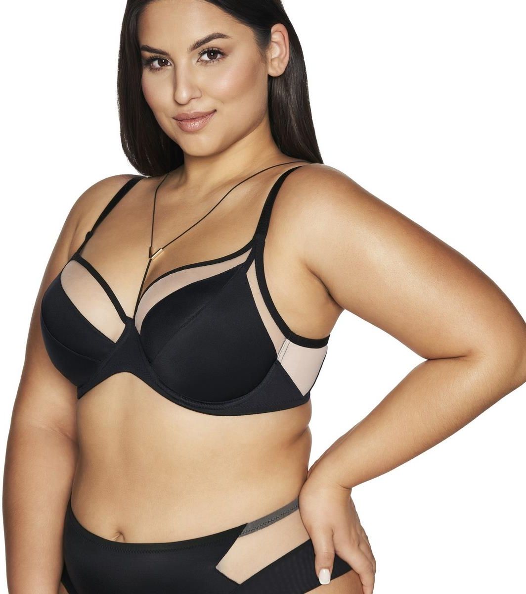Biustonosz typu braletka Viva to esencja subtelnej elegancji i komfortu, gdzie urok tkwi w prostocie. Miękkie miseczki w klasycznym kroju braletki delikatnie otulają piersi, zapewniając im idealne podtrzymanie i kształt. Czarna dzianina, osłaniająca centralną część piersi, tworzy wyrazisty kontrast z cielistym tiulem, który subtelnie eksponuje fragmenty nagiej skóry, dodając całości zmysłowego charakteru. Jednolity obwód z geometrycznymi wstawkami na bokach stabilizuje biustonosz, zapewniając wygodę noszenia, podczas gdy gładki mostek ukrywa sprytny regulator minimalistycznej ozdoby, która dodaje finezji dekoltowi. Pozwól się oczarować i wybierz Viva – biustonosz, który łączy prostotę z niepowtarzalnym stylem. Skład: 88% Poliamid, 8% Bawełna, 4% Elastan Typ: soft Kolor: czarny Konstrukcja: K-2103 Bralette Ramiączka: nieodpinane, szerokość dopasowana do rozmiaru, regulowane - metalowy, antyalergiczny regulator Zapięcie: dwurzędowa, trójstopniowa haftka Fiszbiny boczne: nie