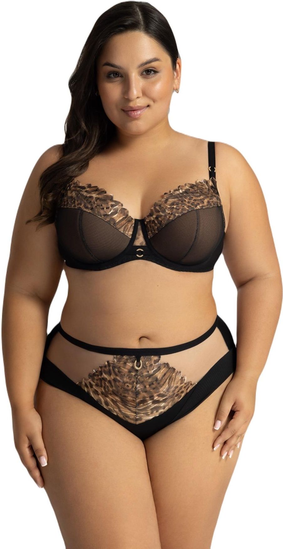 Lianato model dla kobiet, które cenią połączenie zmysłowości i niezawodnego podtrzymania biustu. Półusztywniane miseczki typu semi softzbudowane są na cielistej piance, która perfekcyjnie modeluje piersi, nadając im pożądany kształt i stabilność. Górna część miseczki została wykonana z delikatnego, czarnego tiulu ozdobionego złocistym haftemi subtelnym cętkowanym nadrukiem, które przyciągają wzrok i dodają bieliźnie dzikiego uroku. Dodatkowym atutem modelu jest zalotne wycięcie między piersiamizakończone złotym kółeczkiem, które subtelnie odsłania dekolt i wprowadza nutę kokieterii. Ten dekoracyjny motyw został powtórzony także na ramiączkach, tworząc spójną, biżuteryjną kompozycję. Ramiączka są w pełni regulowane i odpowiednio szerokie, co w połączeniu z szerokim obwodem skutecznie stabilizuje biust, odciążając ramiona i plecynawet przy większych rozmiarach. AV 2143 to nie tylko efektowna bielizna — to model konstrukcyjnie dopracowany, wykonany z oddychających materiałów wysokiej jakości, które dbają o komfort noszenia przez cały dzień. Biustonosz idealnie sprawdzi się zarówno na specjalne okazje, jak i jako codzienna dawka eleganckiej pewności siebie. Skład: 82% Poliamid, 11% Elastan, 5% Poliuretan, 2% Bawełna Typ: semi soft Kolor: czarny Konstrukcja: K-1030 Ramiączka: nieodpinane, szerokość dopasowana do rozmiaru, regulowane - metalowy, antyalergiczny regulator Zapięcie: dwurzędowa/trzyrzędowa, trójstopniowa haftka Fiszbiny boczne: nie