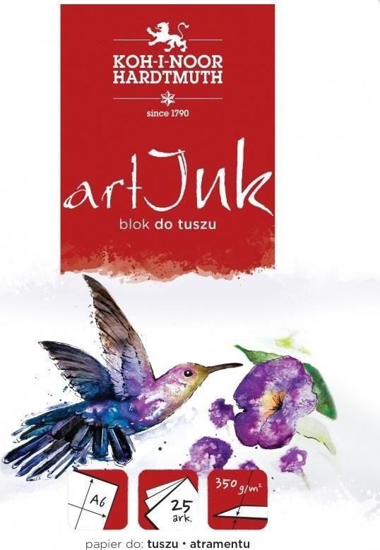 BLOK do TUSZU A6 Koh-I-Noor 350g Art Ink 25 KARTEK Najwyższa Jakość KARTKI Blok Art Ink został wyprodukowany z papieru dwustronnie fakturowanego o lekko kremowym odcieniu. Doskonale nadaje się do rysunków wykonanych tuszem. Papier użyty w bloku nie zawiera kwasu ani metali ciężkich. Posiada naturalne PH i wykonany jest z najwyższej jakości certyfikowanej celulozy. Format: A6 25 arkuszy Gramatura: 350g/m2