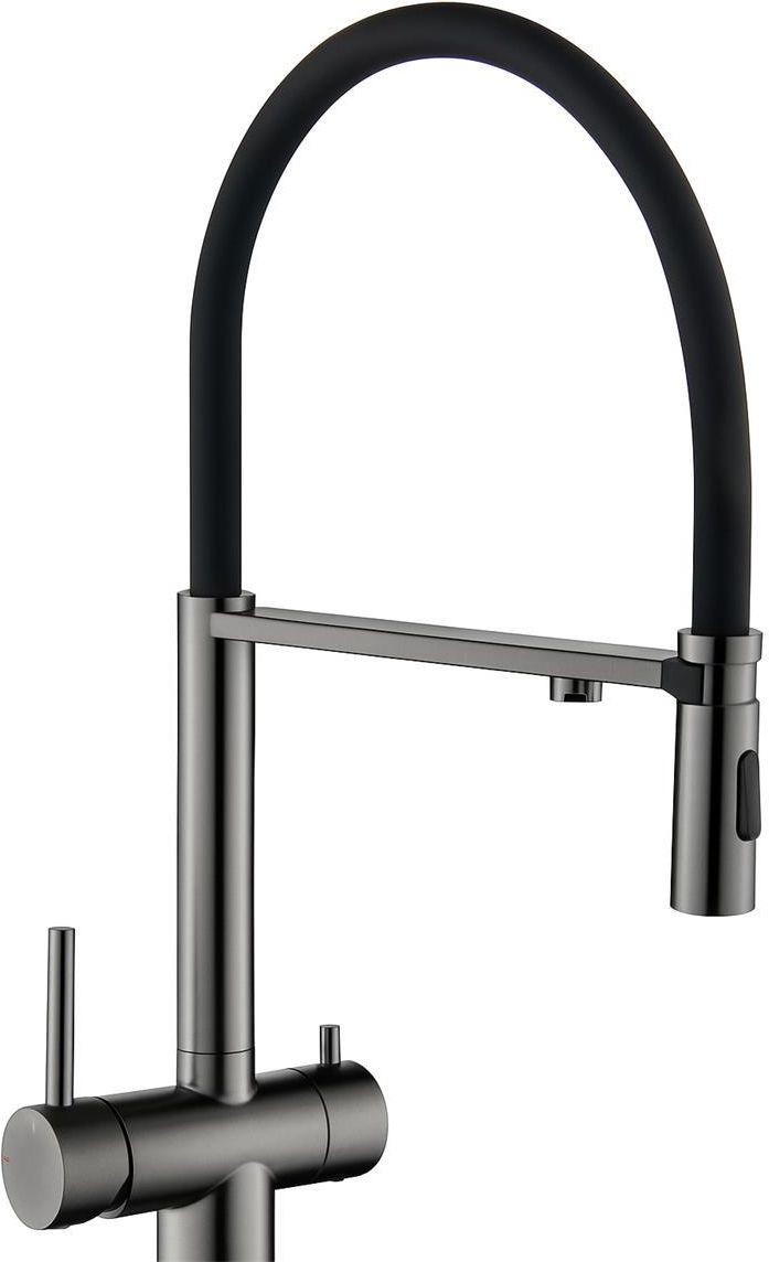 Bateria trójdrożna Blue Water Tusar, grafit (gun metal) Tusar to dwuobwodowa trójdrożna bateria, zaprojektowana do podłączenia wody wodociągowej oraz filtrowanej. Bateria została wyposażona w obracaną, wyciąganą wylewkę o pełnym zakresie ruchu wynoszącym 360°. Dzięki ceramicznym głowicom możliwa jest płynna i precyzyjna regulacja zarówno temperatury i natężenia przepływu, a dzięki wbudowanym perlatorom woda zostaje napowietrzona, co redukuje jej zużycie, jednocześnie zachowując pełną jakość strumienia. Rączka mieszacza odchyla się do przodu, dzięki czemu można montować baterię pomiędzy zlewozmywakiem podwieszanym a ścianą. Model Tusar wyróżnia się trwałością i funkcjonalnością, a jednocześnie zachwyca nowoczesnym designem. Posiada elegancko wyprofilowaną wylewkę, która pasuje do wielu wnętrz. Dwa niezależne obwody Bateria Blue Water Tusar posiada dwa niezależne obwody. Prawe pokrętło umożliwia regulację temperatury poprzez mieszanie wody ciepłej i zimnej. Natomiast lewe pokrętło pozwala na korzystanie z czystej, przefiltrowanej wody, na przykład z systemu odwróconej osmozy. Dodatkowe informacje Materiał: stal nierdzewna Wykończenie: grafit (gun metal) Wylewka obrotowa do 360° Głowice ceramiczne Dwa perlatory Dwa elastyczne wężyki podłączeniowe 3/8“ – 400 mm rączka mieszacza odchyla się do przodu, dzięki czemu można montować baterię pomiędzy zlewozmywakiem podwieszanym a ścianą Wymiary: rysunek techniczny baterii dostępny na dole strony produktu