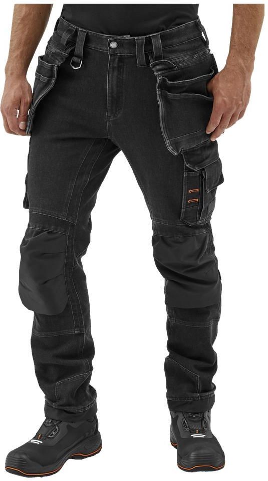 Spodnie robocze z czarnego dżinsu z czterokierunkowym streczem. Kieszenie na nakolanniki wzmocnione materiałem Cordura i odpinane kieszenie na gwoździe.