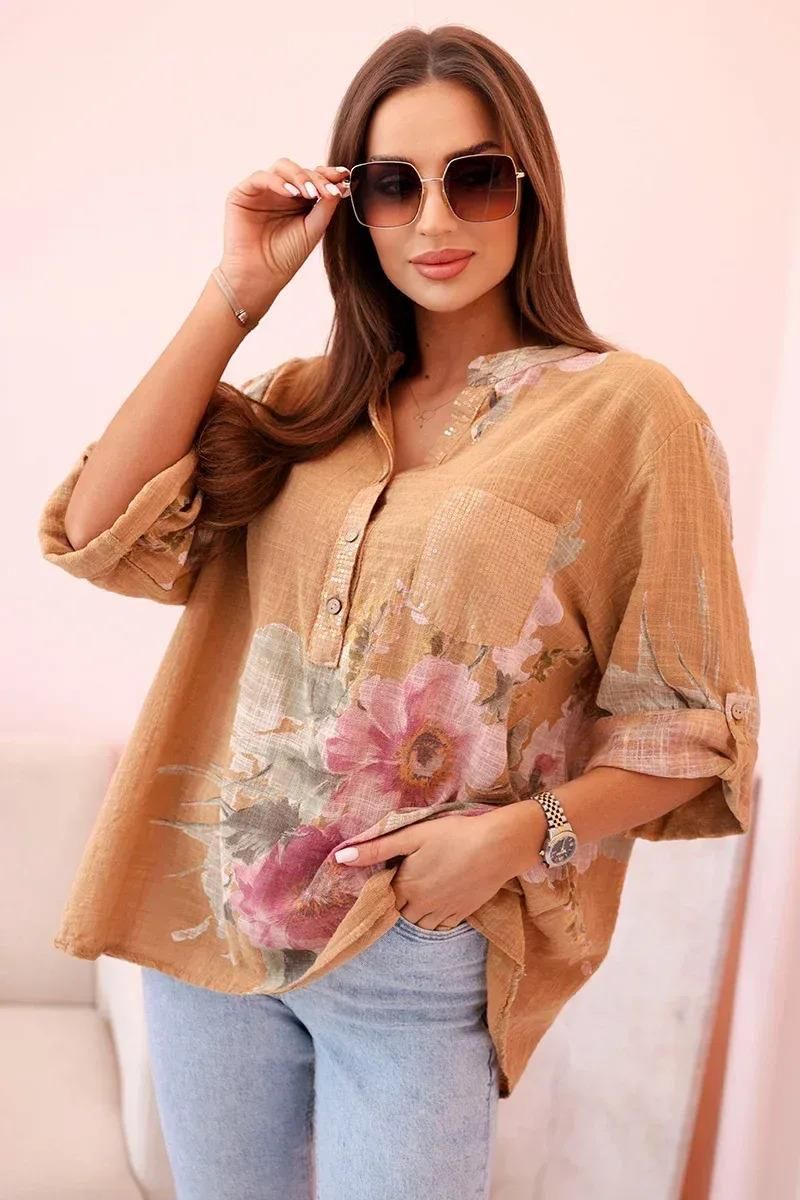 Bluzka damska z bawełny z kwiatowym wzorem i guzikami camelowa - Uniwersalny Łódź