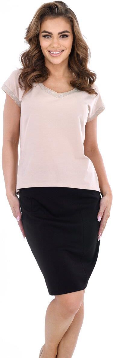 Bluzka z gładkiej dzianiny. Dekolt w serek i podkrój pachy wykończony kontrastową lamówką. Ramię lekko opadające tworzące mały rękawek. Na tyle bluzki mały karczek. Dekolt typu V optycznie wysmukli górne partie sylwetki. Dół przodu bluzki lekko podkrojony a tył wydłużony. Bluzka zachowana w codziennej stylistyce. Będzie świetną bazą do miejskich i sportowych stylizacji. Pasuje pod żakiet do jeansów, oraz sportowych spódnic. Skład materiału: 91 bawełna%, 9 %poliester PRODUKT POLSKI kupując polskie marki wspierasz rozwój rodaków. Polska rośnie w siłę.