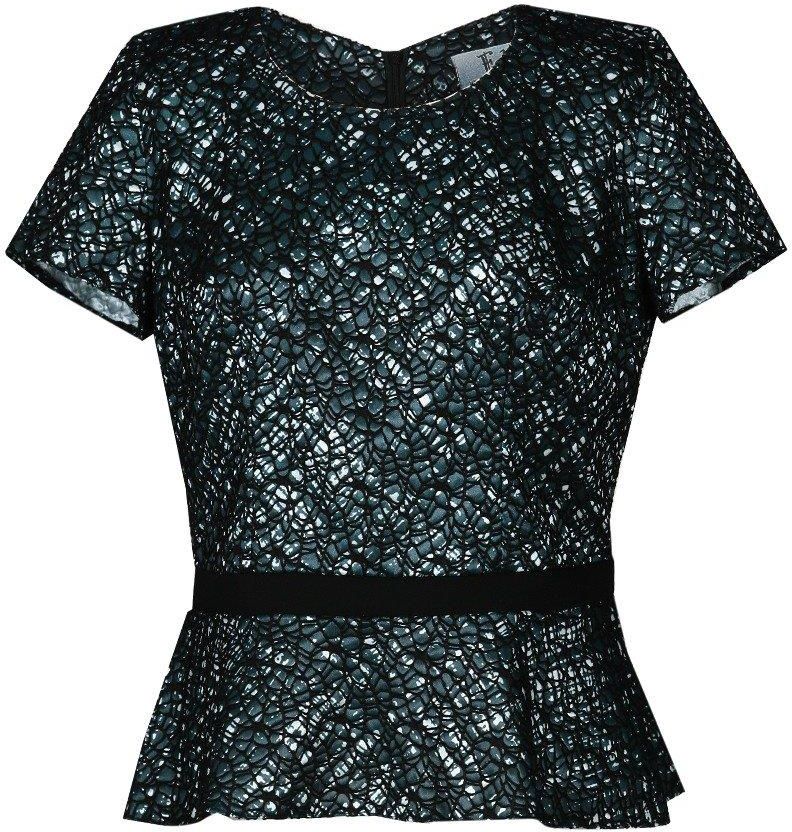 Fason: odcięta w pasie, baskinka Dekolt przód: okrągły Plecy: zabudowane Zapięcie: suwak kryty z tyłu Rękaw: krótki Materiał: dzianina strukturalna - koronka