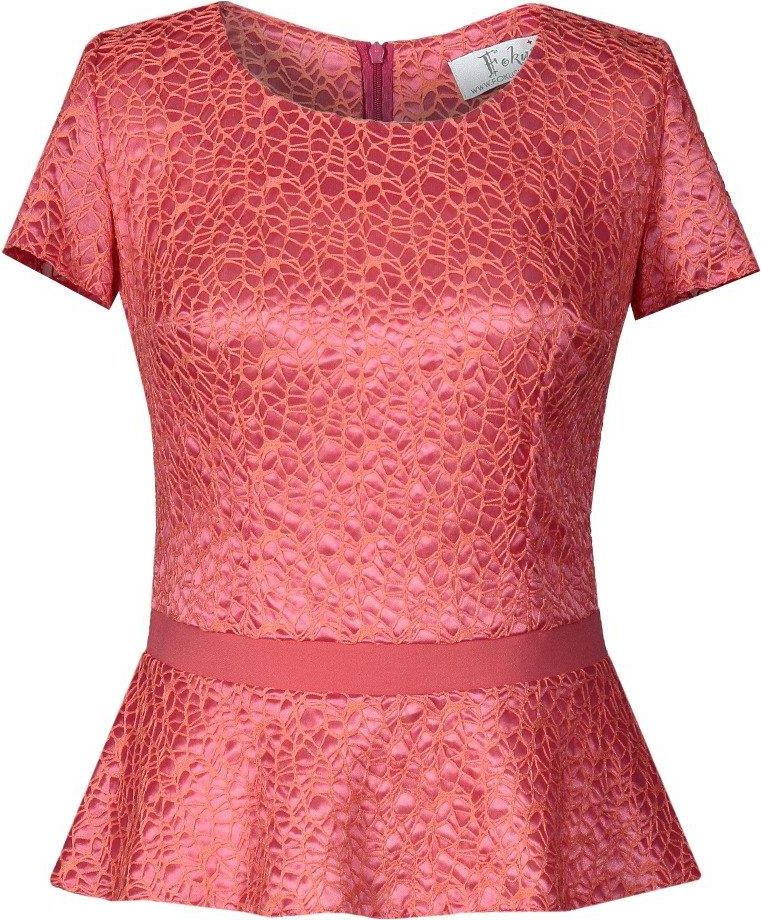 Fason: odcięta w pasie, baskinka Dekolt przód: okrągły Plecy: zabudowane Zapięcie: suwak kryty z tyłu Rękaw: krótki Materiał: dzianina strukturalna - koronka