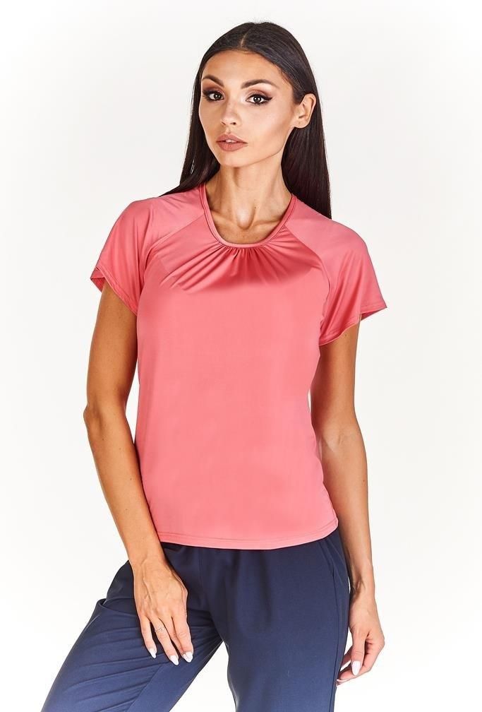 Letnia bluzka, uszyta z elastycznej dzianiny w połączeniu z koronką. Dekolt okrągły marszczony na środku przodu, wykończony lamówką. Rękaw reglan krótki. Z tyłu skośne pionowe cięcia, wstawka z koronki oraz naszyte perełki. Bluzkę można łączyć z klasycznymi spodniami oraz spódnicami, jak i swobodnymi dżinsami. Skład surowcowy: 94% wiskoza, 6% lycra. PRODUKT POLSKI Kupując polskie marki wspierasz rozwój rodaków. Polska rośnie w siłę.