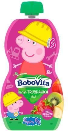 BoboVita Mus banan truskawka kiwi po 6 miesiącu 100g Opis produktu BoboVita Świnka Peppa Mus banan truskawka kiwi po 6 miesiącu. produkt dla niemowląt i małych dzieci pyszny mus owocowy z ulubionymi bohaterami bajki Peppa Pig idealny do podania maluszkowi zarówno w domu jak i na spacerze bez dodatku cukru (zawiera naturalnie występujące cukry z owoców) zgodnie z przepisami prawa żywność dla niemowląt i małych dzieci nie zawiera konserwantów, barwników i wzmacniaczy smaku produkt bezglutenowy nie zawiera mleka Składniki: banan 33%, jabłko 28,5%, truskawka 20%, kiwi 17%, czarna marchew, witamina C, zagęszczony sok cytrynowy. Przechowywanie i przygotowanie: przed otwarciem przechowuj produkt w suchym miejscu, w temperaturze pokojowej. Po otwarciu zamkniętą tubkę możesz przechowywać w lodóce przed 24 godziny pod warunkiem, że dziecko nie jadło bezpośrednio z tubki. Nie używaj produktu, jeśli zauważysz, że opakowanie jest uszkodzone. Należy przestrzegać instrukcji właściwego przygotowania. Wymieszaj produkt w tubce przed podaniem. Wyciśnij zawartość tubki do miseczki lub bezpośrednio na łyżeczkę. Dziecko powyżej 12. miesiąca życia może jeść produkt bezpośrednio z tubki wyłącznie pod opieką dorosłego. Zakrętkę z opakowania należy trzymać poza zasięgiem dziecka. Produkt pakowany w atmosferze ochronnej. Produkt utrwalony termicznie: pasteryzowany.