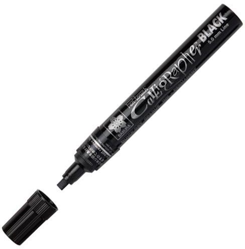Marker olejny Calligrapher Pen Touch Sakura - 5 mm Black Calligrapher PenTouch Sakura o grubości 5 mm to uniwersalny marker na bazie farby olejnej. Pisak nadaje się do różnych powierzchni, takich jak: papier, plastik, drewno, ceramika, szkło, guma czy kamień. Płaska końcówka pozwala na uzyskanie cienkiej i grubej linii. Calligrapher zawiera szybkoschnącą, wytrzymałą i dobrze kryjącą farbę. Przed użyciem pisak należy wstrząsnąć.