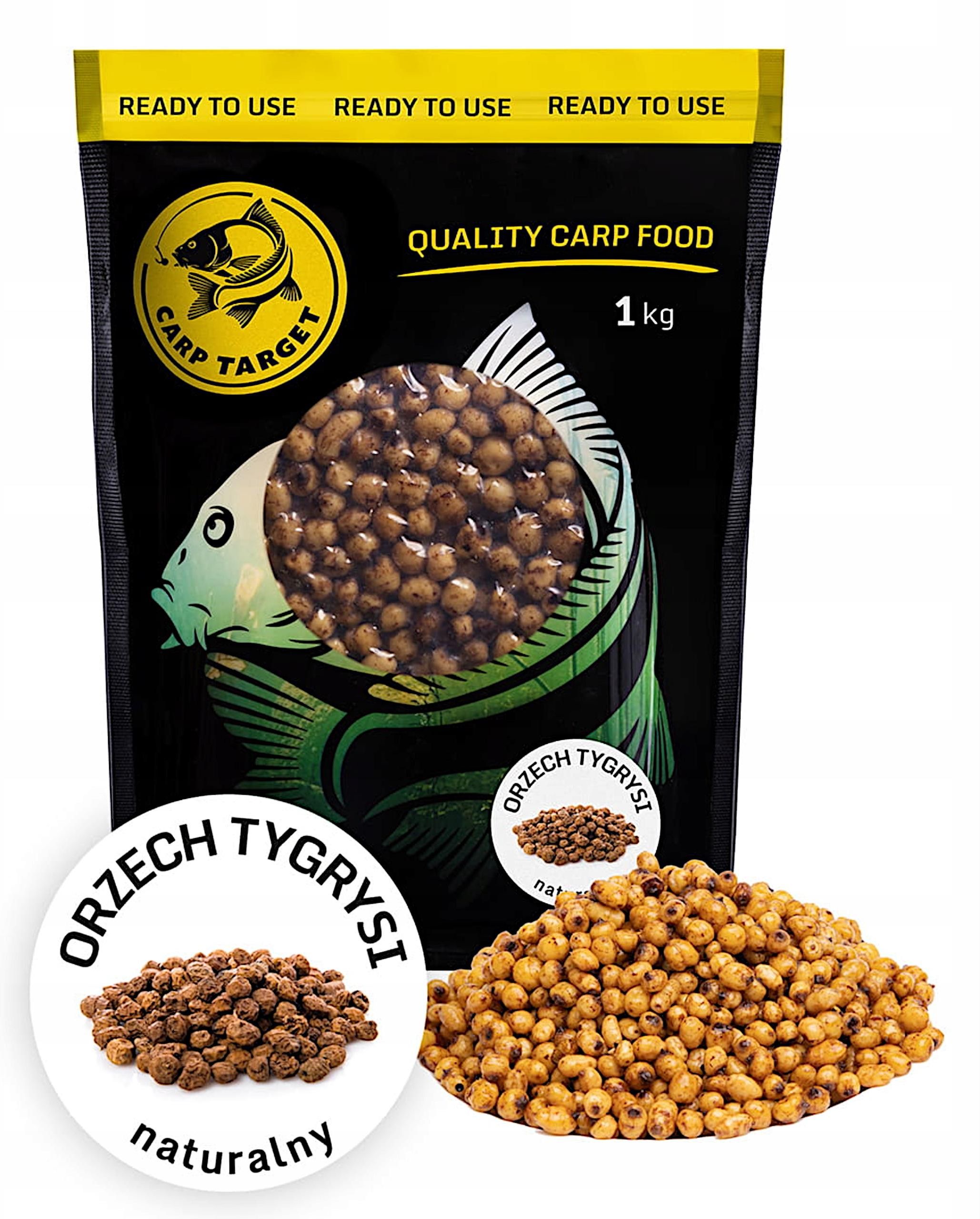 Carp Target Gotowa Zanęta Orzech Tygrysi / 1 kg Szukasz skutecznej zanęty, która przyciągnie na łowisko naprawdę duże okazy? Orzech tygrysi świetnie nadaje się do wabienia karpia i amura. Gotowa Zanęta Orzech Tygrysi 1 kg Profesjonalnie przygotowane ziarna orzecha tygrysiego, gotowe do użytku bezpośrednio z opakowania. Aby jednak orzechy tygrysie były skuteczne, muszą być odpowiednio przygotowane. Jest to czynność dość czasochłonna, dlatego polecamy gotowe ziarna orzecha tygrysiego. Są one świetnym rozwiązaniem szczególnie w momencie, kiedy nie masz czasu na samodzielne przygotowanie ziarna lub chcesz mieć pewność, że będą one odpowiednio przygotowane. Specyfikacja: ✅ Ziarno: Orzech Tygrysi ✅ Aromat i smak: Naturalny ✅ Pakowanie: Próżniowe, 98% próżni ✅ Waga netto: 1 kg Ziarna orzecha tygrysiego doskonale wabią nawet najostrożniejsze karpie - ryby te uwielbiają gotowanego orzecha i chętnie po niego wracają. Czym charakteryzują się ziarna Carp Target Konopie, Rzepik ? Gotowane ziarno orzecha tygrysiego Carp Target 8-12 mm jest wcześniej odpowiednio długo moczone, gotowane a następnie pakowane próżniowo, dzięki temu zachowuje długotrwałą świeżość; możesz liczyć na gwarantowaną świeżość, dzięki 98% próżni. naturalny aromat przyciąga ryby nawet z dalekich odległości, a szczelne opakowanie chroni zawartość przed wilgocią i utratą świeżości. Dzięki temu masz pewność, że Twoje łowisko będzie pełne aktywnych ryb przez długi czas. podobnie jak inne ziarna wędkarskie, gotowe ziarna orzecha tygrysiego przygotowywane są z najwyższej jakości składników, pozyskiwanych wyłącznie od sprawdzonych dostawców; Ziarna są parowane powoli w temperaturze maksymalnej do 92,5 stopnia Celsjusza aż do 8 godzin, co powoduje, że zachowują najwięcej wartości odżywczych. zanęta orzech tygrysi jest w 100% naturalna, przygotowana bez dodatku konserwantów. Zanęta orzecha tygrysiego jest bardzo skuteczna w okresach, gdzie ryba intensywnie żeruje i szuka dużej ilości pożywienia. Warto stosować ją razem z konopią lub innym ziarnem o mniejszej frakcji.