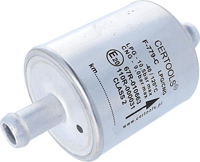 Opis produktu Filtr fazy lotnej CERTOOLS - F-779/C 12/12 mm (bibuła, jednorazowy) – jednorazowy filtr fazy lotnej F-779/C firmy CERTOOLS z niewymiennym wkładem. Opis zastosowania Filtr fazy lotnej CERTOOLS - F-779/C 12/12 mm (bibuła, jednorazowy) – filtr stosowany w części niskociśnieniowej samochodowych instalacji gazowych IV generacji (sekwencyjnych wstrysków gazu w fazie lotnej), w której LPG występuje w fazie lotnej. Montowany pomiędzy reduktorem, parownikiem a listwą wtryskiwaczy gazowych zabezpiecza je przed zanieczyszczeniami mogącymi pojawić się w autogazie. Dane techniczne Filtr fazy lotnej CERTOOLS - F-779/C 12/12 mm (bibuła, jednorazowy): materiał obudowy – stop aluminium, materiał filtracyjny – papier (bibuła filtracyjna), średnica zewnętrzna króćca wejściowego – 12 mm, średnica zewnętrzna króćca wyjściowego – 12 mm, kierunek przepływu gazu – określony na obudowie, ciśnienie kwalifikacyjne – 450 kPa, zakres zalecanej temperatury pracy – od -40 do 120ᵒC, homologacja na LPG – E20-67R-010663, homologacja na CNG – E20-110R-000031, zalecana wymiana – co 10 000-15 000 km lub zgodnie z wymaganiami producenta. Cechy produktu Typ filtra: jednorazowy Model filtra: F-779/C Wkład: bibuła (papier) Wejście: 12 mm Wyjście: 12 mm Obudowa: metal Sposób montażu: na przewodzie Rodzaj części: zamiennik Informacje dodatkowe Kod produktu Nagaz: 32.CRT.409 Producent: CERTOOLS Kod producenta: 53-779-01212G Numer homologacji: E20-67R-010663